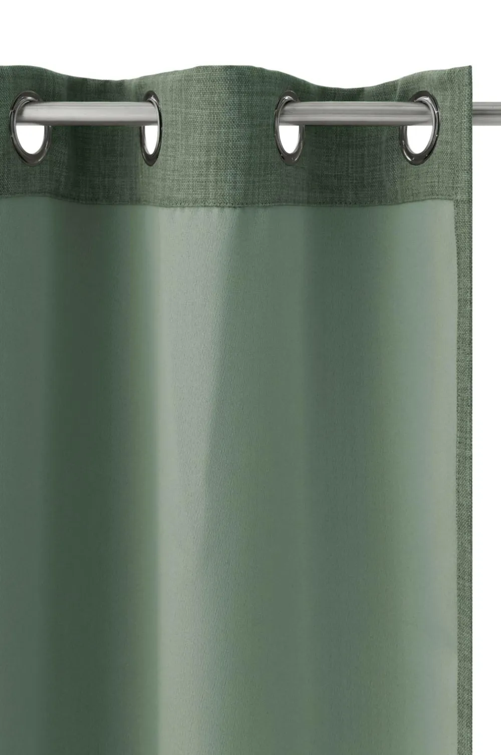 Mørklæggende gardin i hørlook med struktur og meleret effekt. Sejlringe i sølvfarvet metal. Et vævet mellemlag med indvævede sorte tråde gør, at gardinet lukker lyset ude. Matchende farve tone-i-tone på bagsiden. Bredde 140 cm. 2 længder: 220 og 250 cm. Stryges fugtige ved middelvarme på bagsiden.