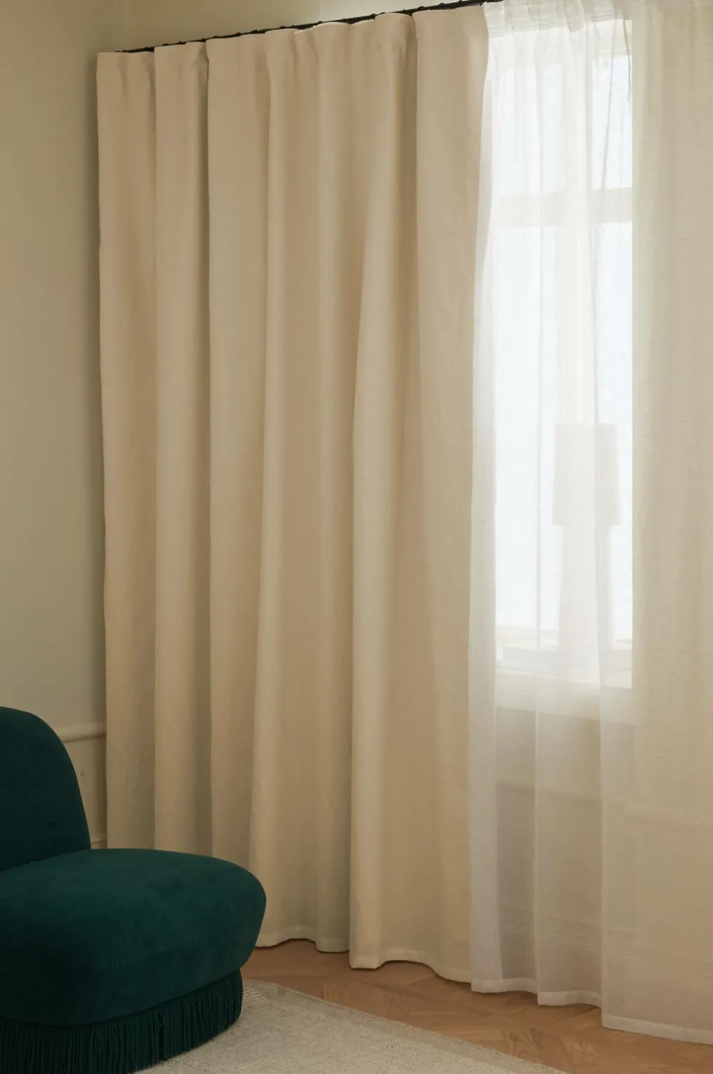 To-lags mørklægningsgardin, et lag i hørblanding og et mørklægningslag i genbrugspolyester.