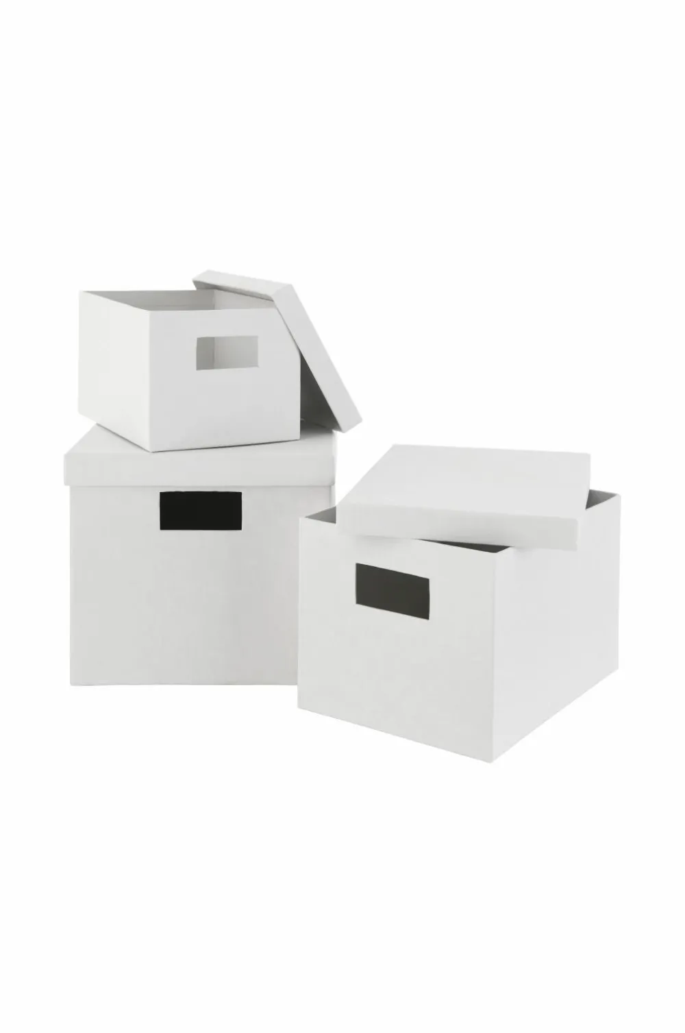 3 stk. opbevaringsbokse i forskellige størrelser med låg. Af genindvundet, håndlavet papir/karton.