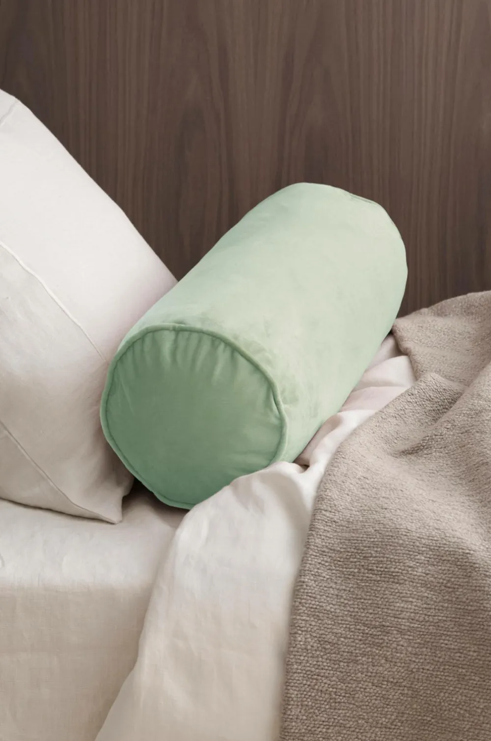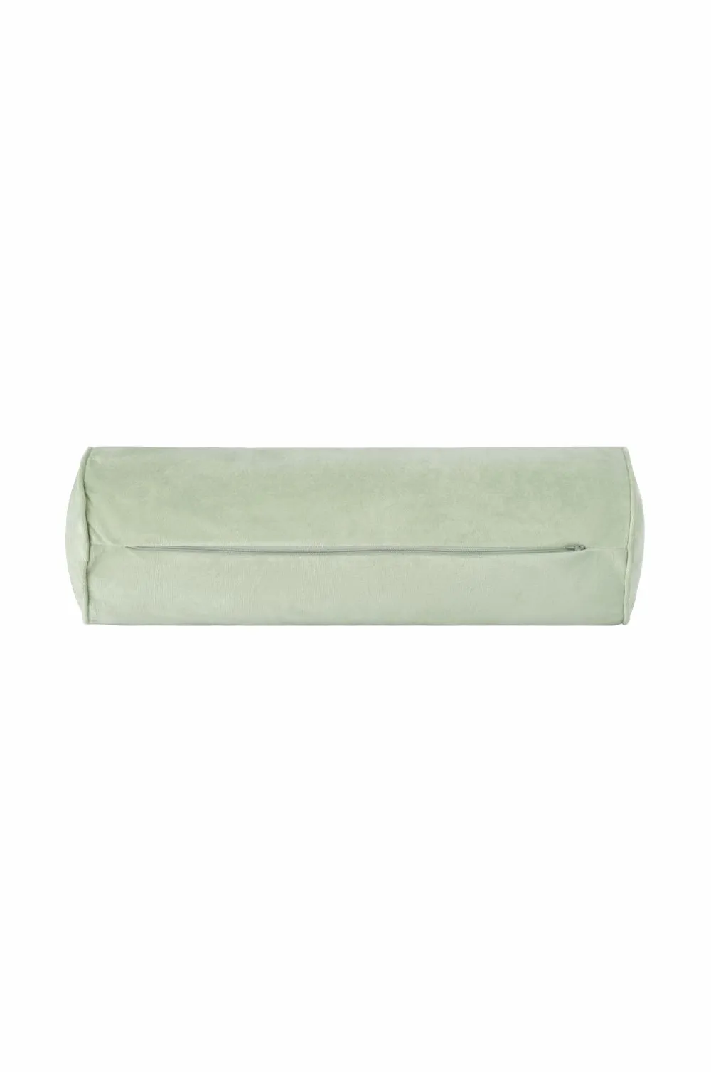 Cylinderformet pude i velour med monteringspude i polyester. Paspoleret kant i enderne. Af genindvundet polyester. Lynlås på undersiden. Bredde 55 cm, diameter 18 cm.