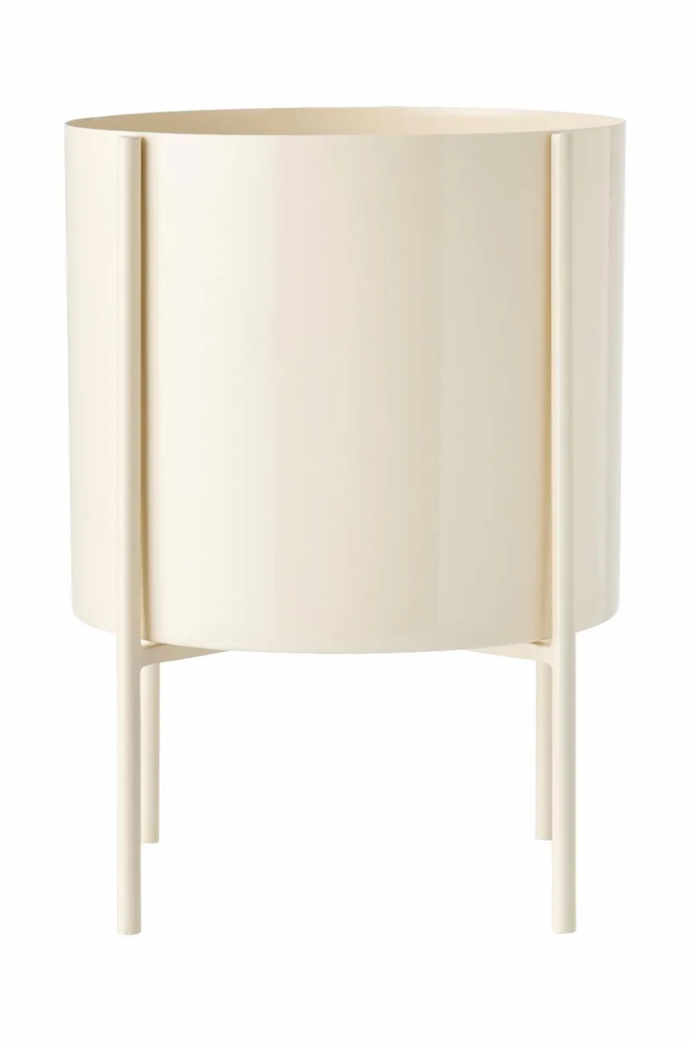 Potteskjuler af jern med stativ på 4 ben. Stativet er vendbart, og urtepotteskjuleren kan placeres på begge sider af stativet for forskellig højde. Krukkens mål: Højde 22 cm, Ø 25 cm. Placeret i stativet er den højeste højde 45 cm og den lavere højde 35 cm.