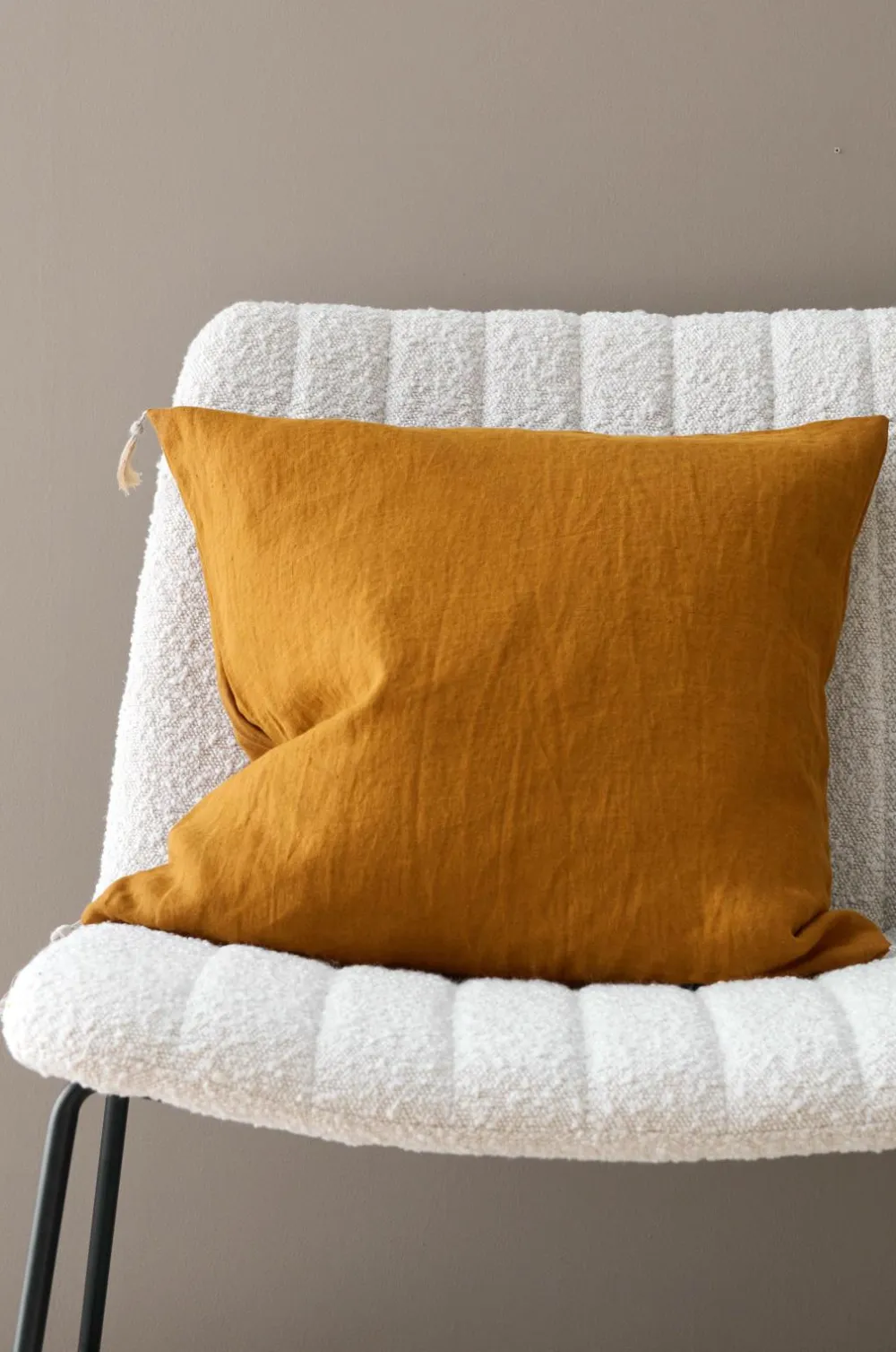 Siddehynde i blød vasket kvalitet af fransk hør med vintagelook og dekorative, håndsyede sting. Kvaste af hørgarn i alle hjørnerne. Skjult lynlås i bunden. Str. 50×50 cm.