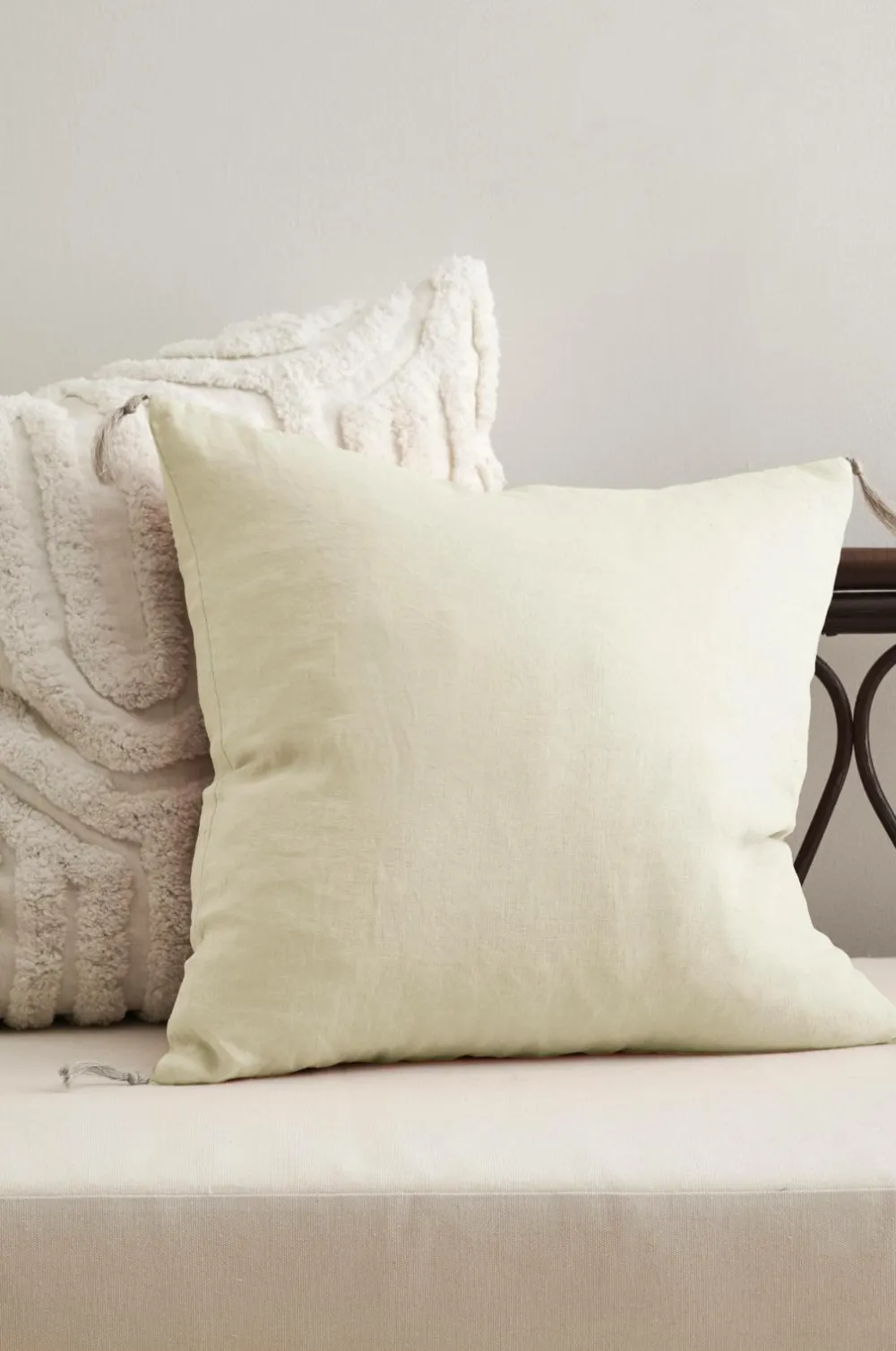Siddehynde i blød vasket kvalitet af fransk hør med vintagelook og dekorative, håndsyede sting. Kvaste af hørgarn i alle hjørnerne. Skjult lynlås i bunden. Str. 50×50 cm.