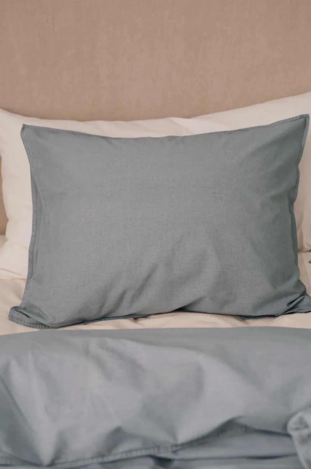 Pudebetræk i vintagevasket økologisk bomuld. Trådtæthed 144 TC. Dobbelte jeanssømme hele vejen rundt. Leveres i stofpose i samme kvalitet med løbegang. Str. 50×60 cm.