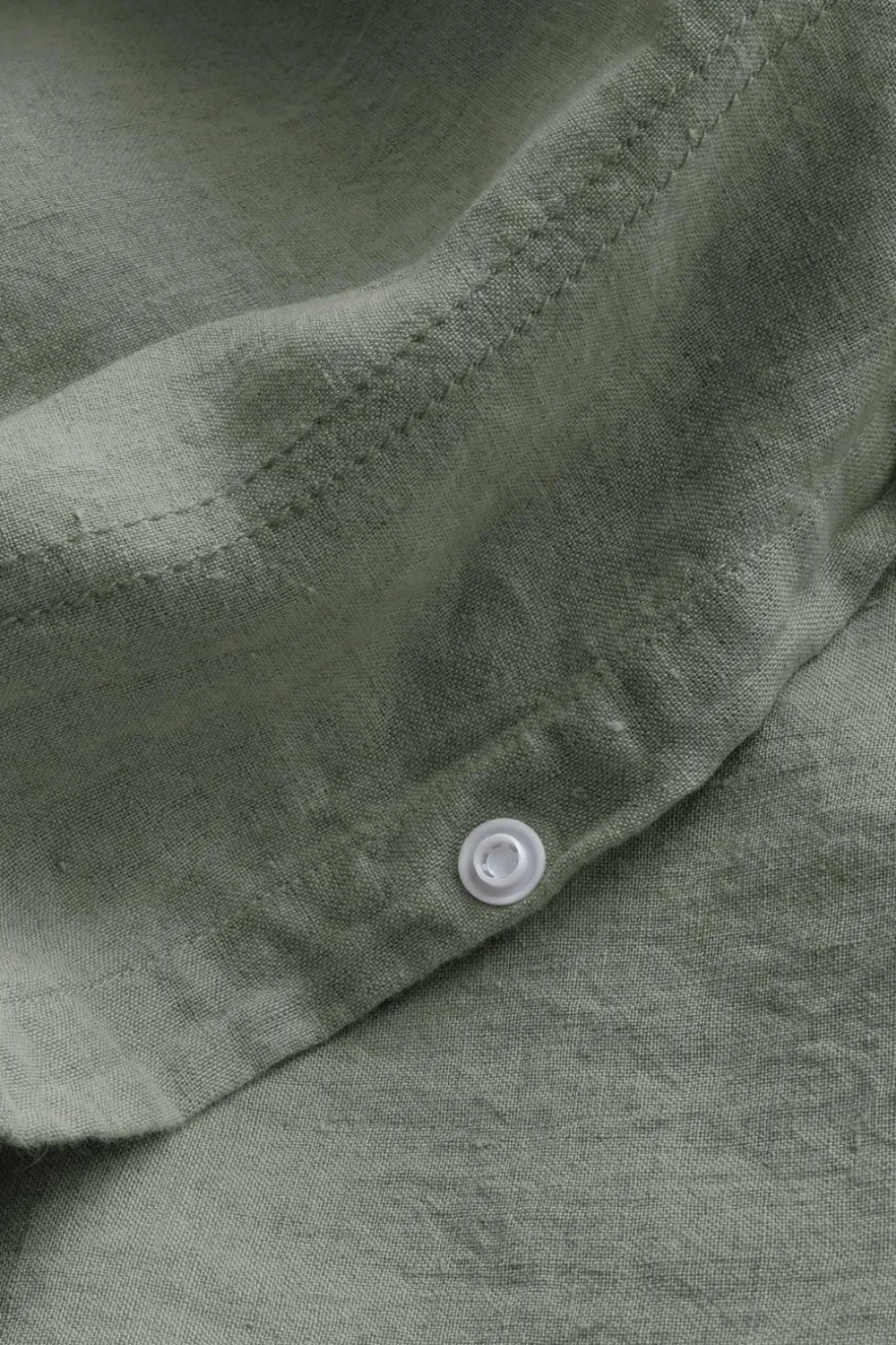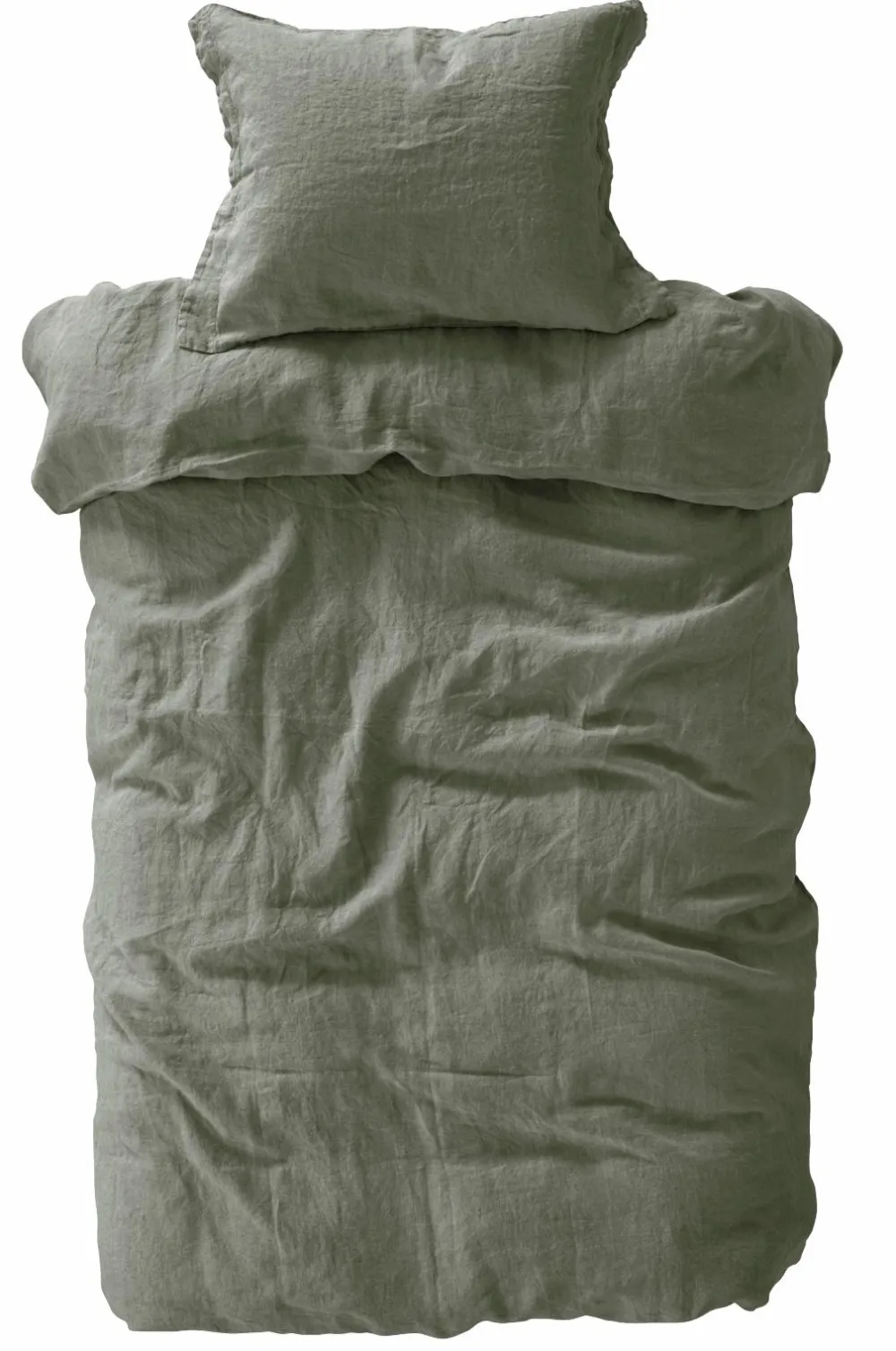 Sengesæt i herlig, vasket kvalitet af fransk hør. Trykknapper i kanten forneden på dynebetrækket. Uden huller i siden til brug ved opredning. Pudebetræk med 5 cm vinge på kortsiderne. Vægt 165 g/m2.