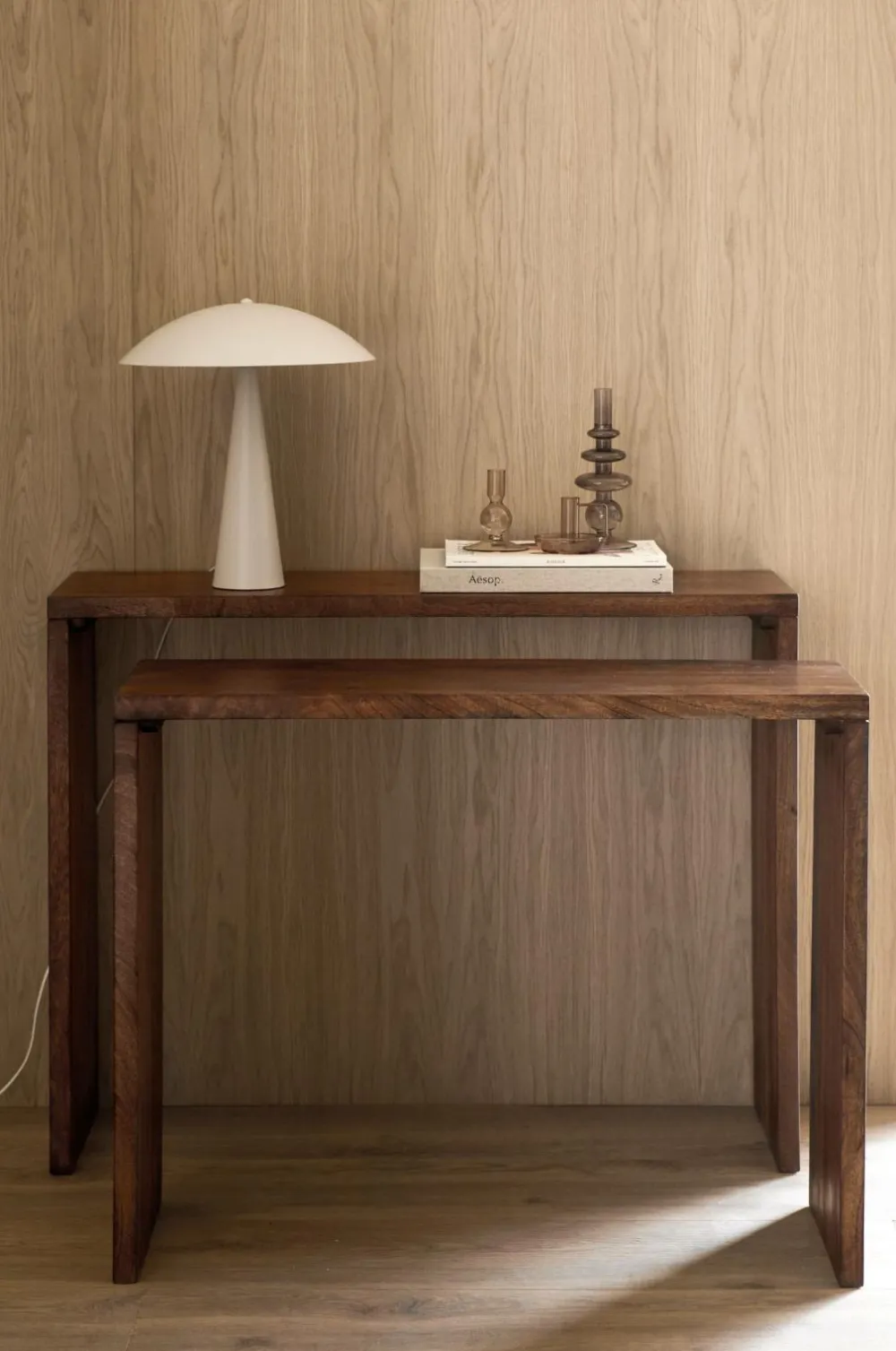 2 sideborde / skriveborde i forskellige størrelser. Kan anvendes separat eller sammen. Af massivt mangotræ med vokset finish. Lev. samlet.