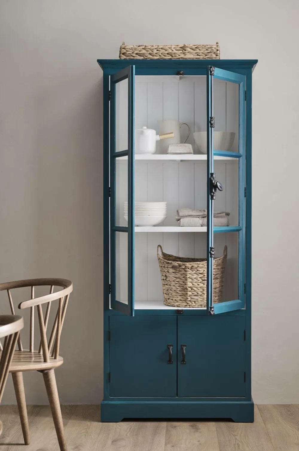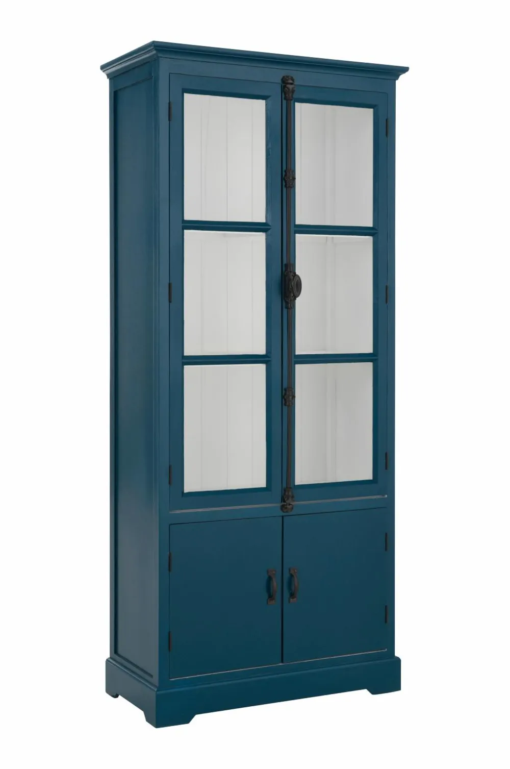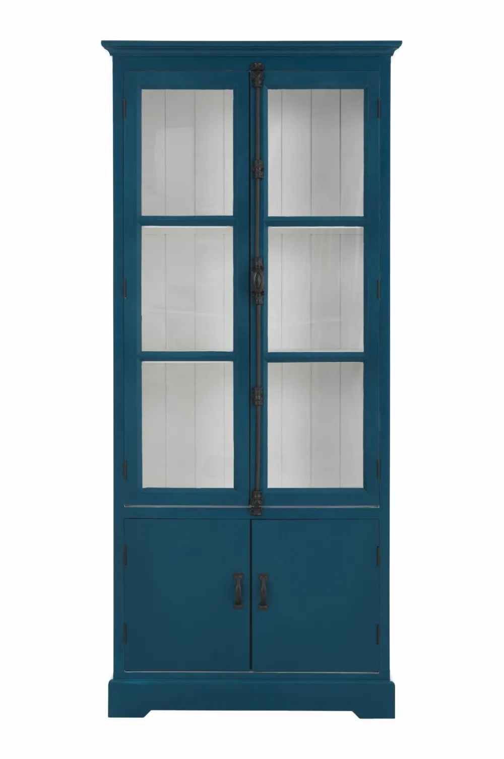 Skab med vitrinelåger og drejehåndtag. Bagstykke og bund af gran. Sidepaneler, overdel og hylder af MDF. Låger af MDF og glas, tykkelse 3 mm. 2 faste hylder af træ. Underskab uden hylder. Højde 180 cm. Dybde 40 cm. Bredde 80 cm. Maksimal belastning pr. hylde 20 kg. Lev. monteret.