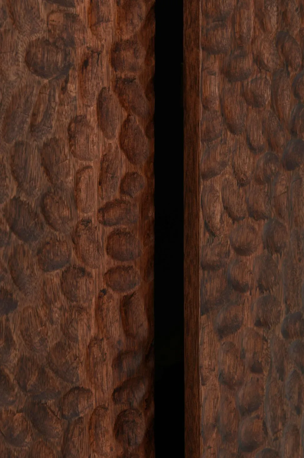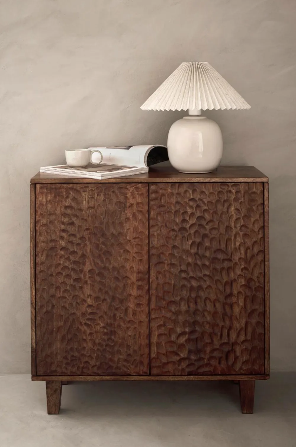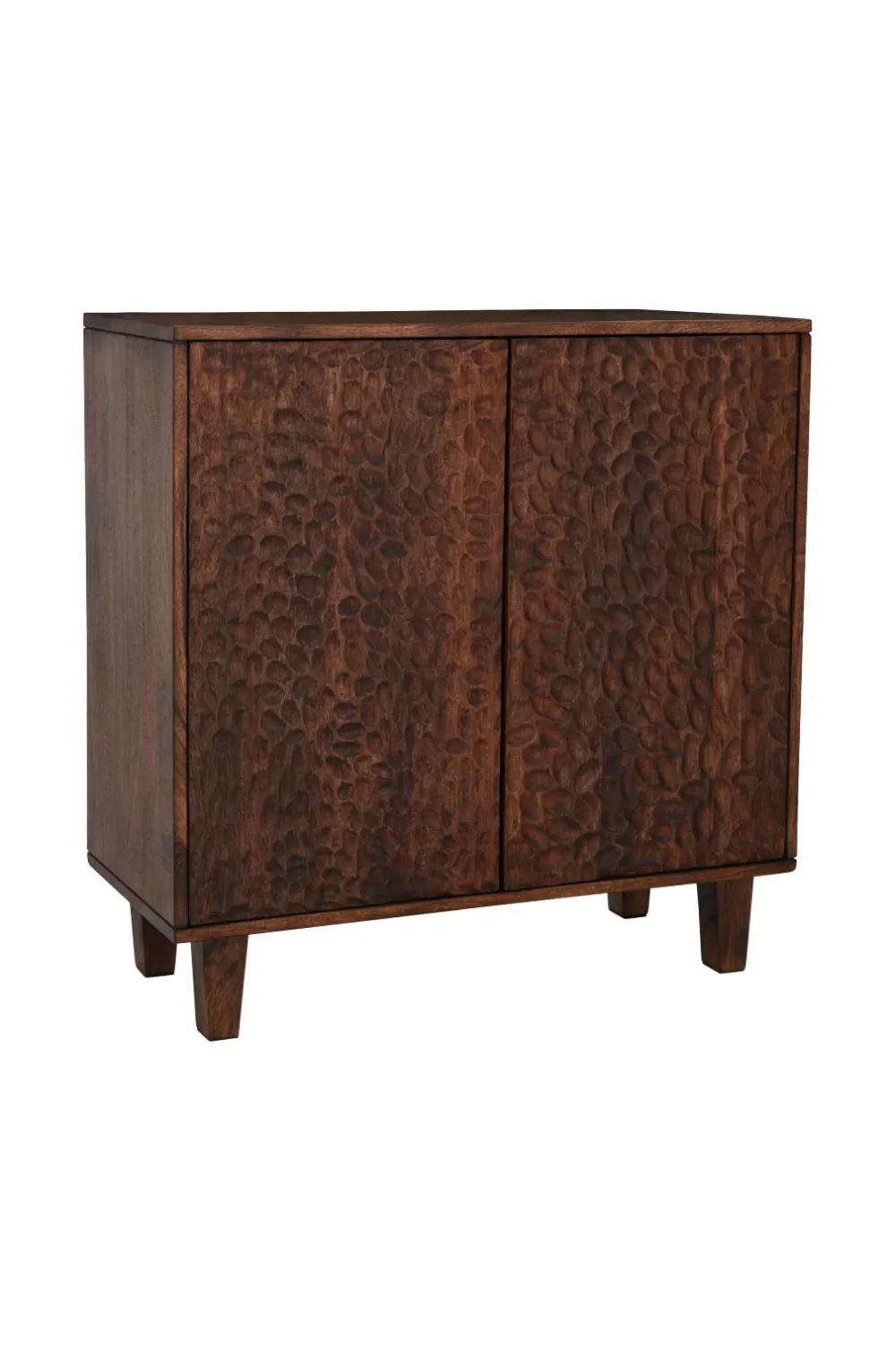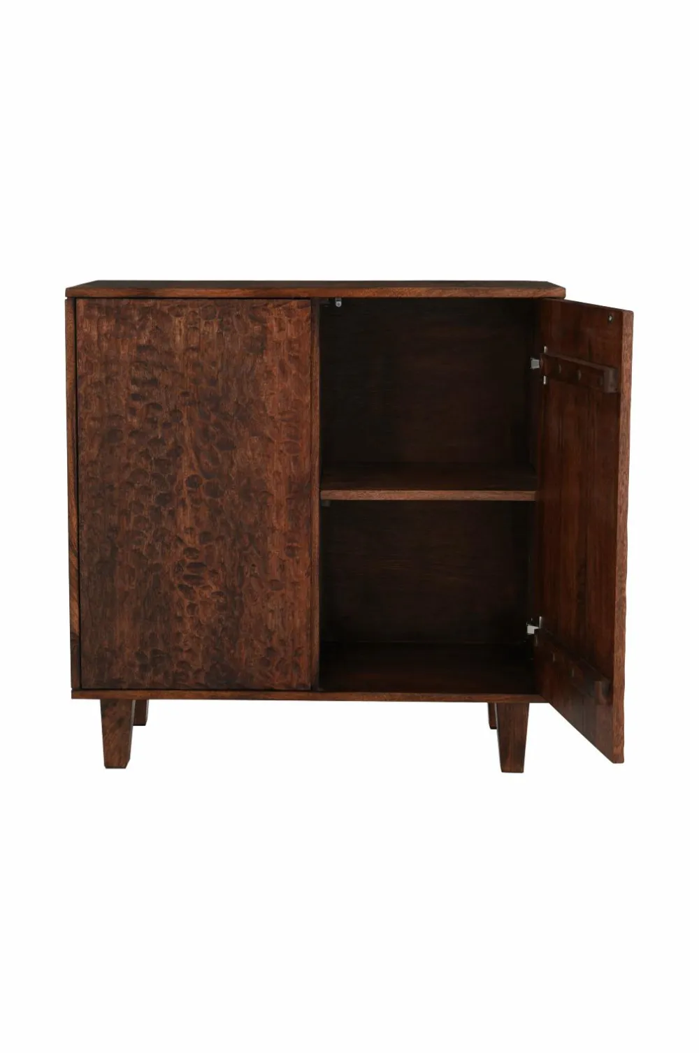 Skænk af massivt mangotræ med vokset finish. 2 skabe med låger som har et smukt udskåret mønster. Lågerne har push-funktion. 1 fast hylde i hvert skab. Højde mellem hylder 31 cm. Frihøjde under møbel 13 cm. Lettere montering (kun benene skrues på).