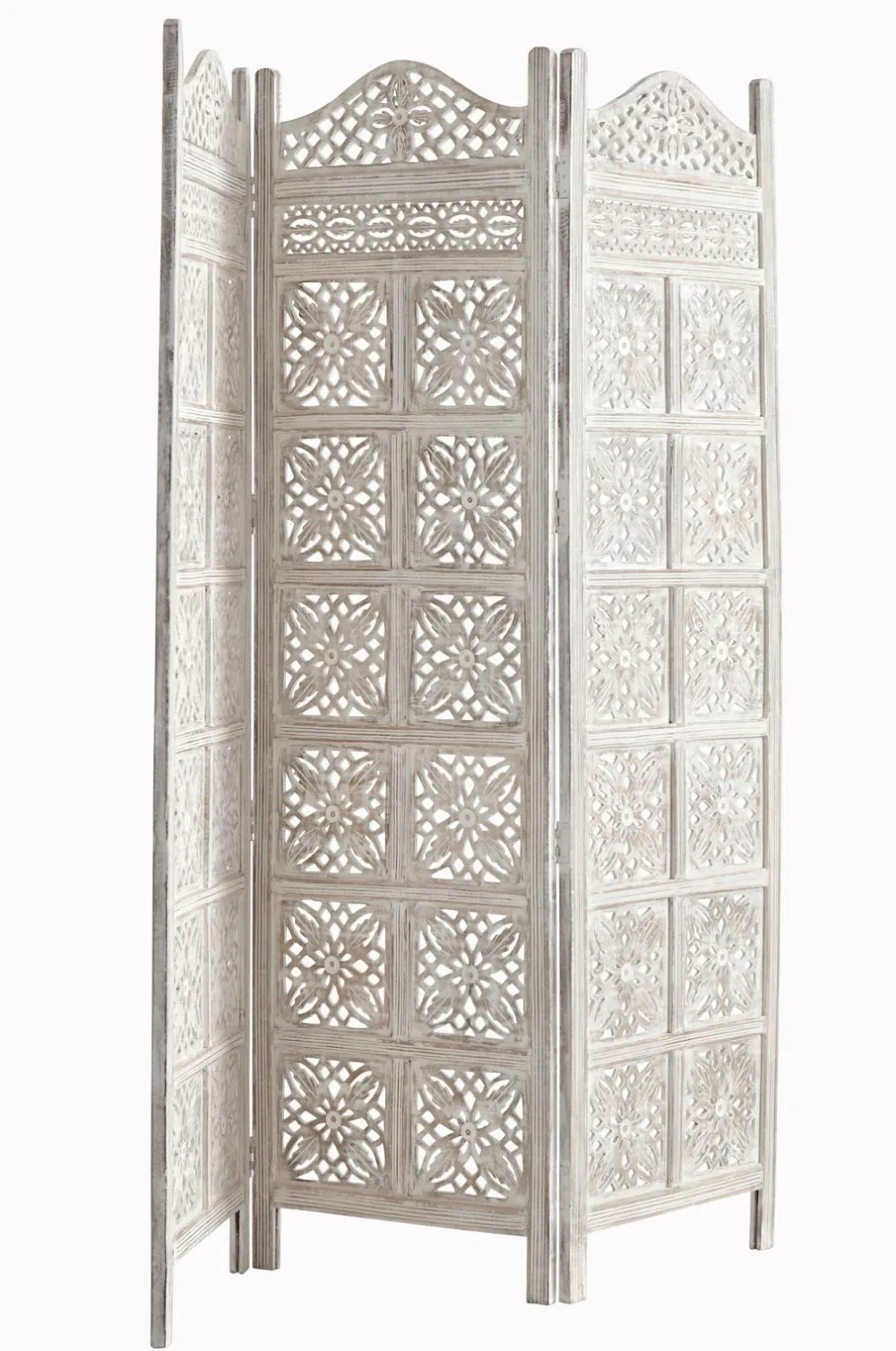 3-delt skærmvæg af massivt, antikmalet mangotræ med udskåret mønster. H 180 cm. B 150 cm. Vægt 25 kg.