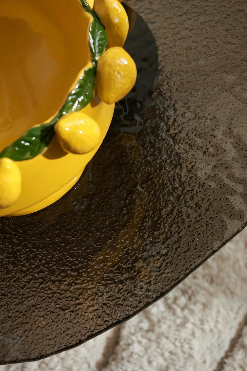 • Bordplade i hærdet, bronzefarvet glas med en lidt uregelmæssig form