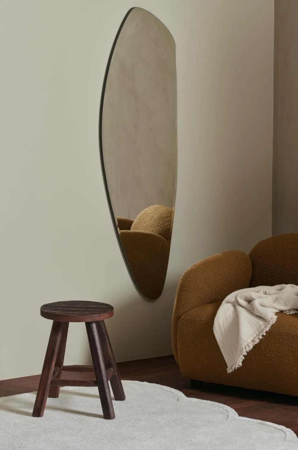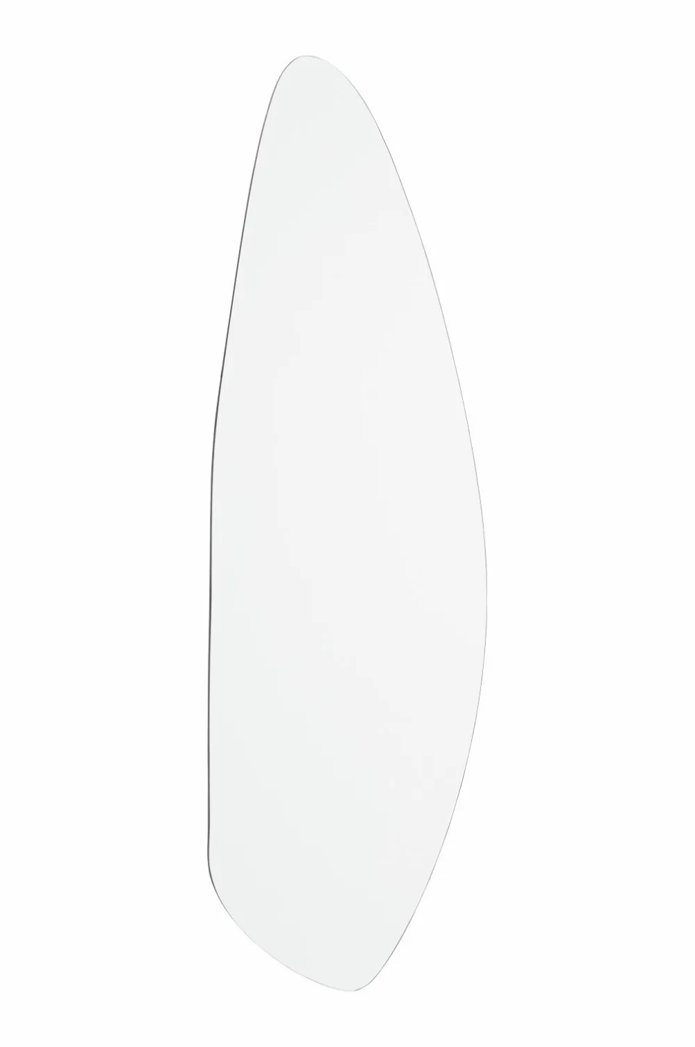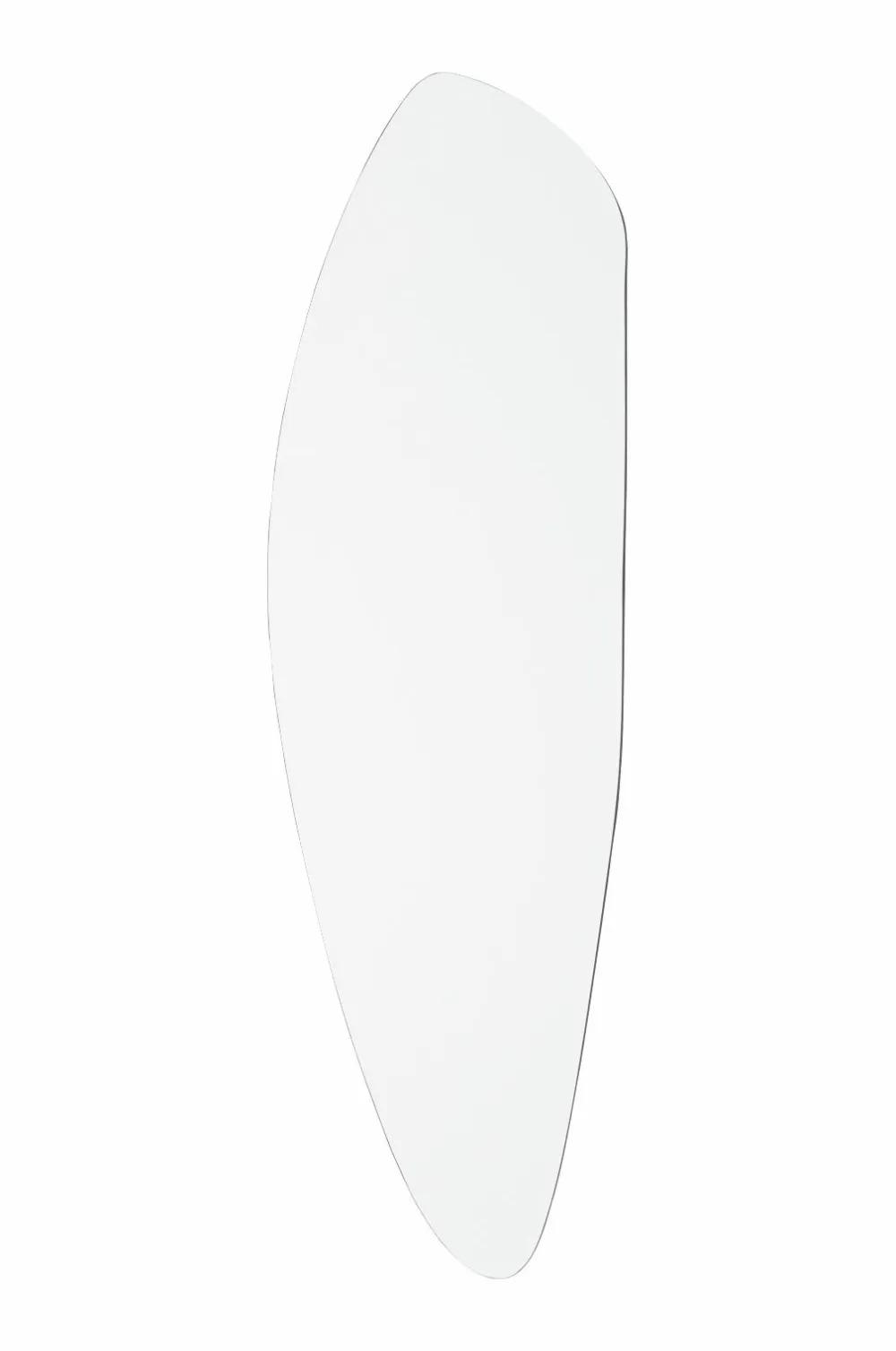 Spejl med uregelmæssig, organisk form og faset kant rundt om. Til vægophængning. Bagside i MDF. Spejlet kan hænges med enten den smallere eller bredere side opad.