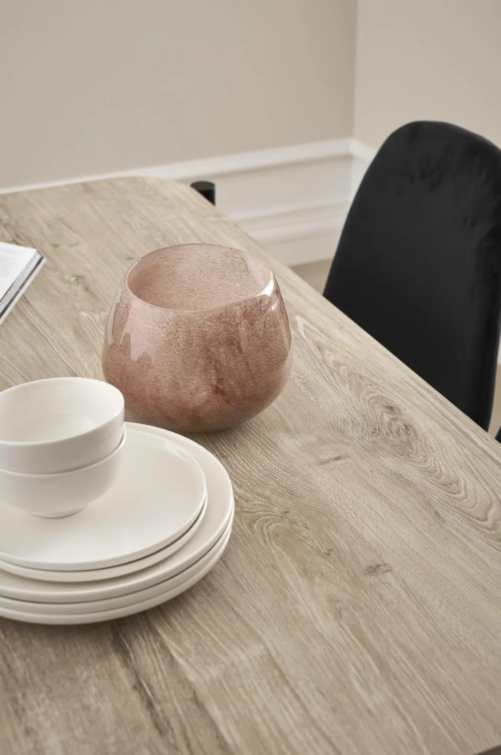Spisegruppe med et bord og fire stole. Bordet har pulverlakerede metalben og en plade i folieret MDF. Stole med pulverlakerede metalben. Sæde med fløjlspolstring og skumfyld.