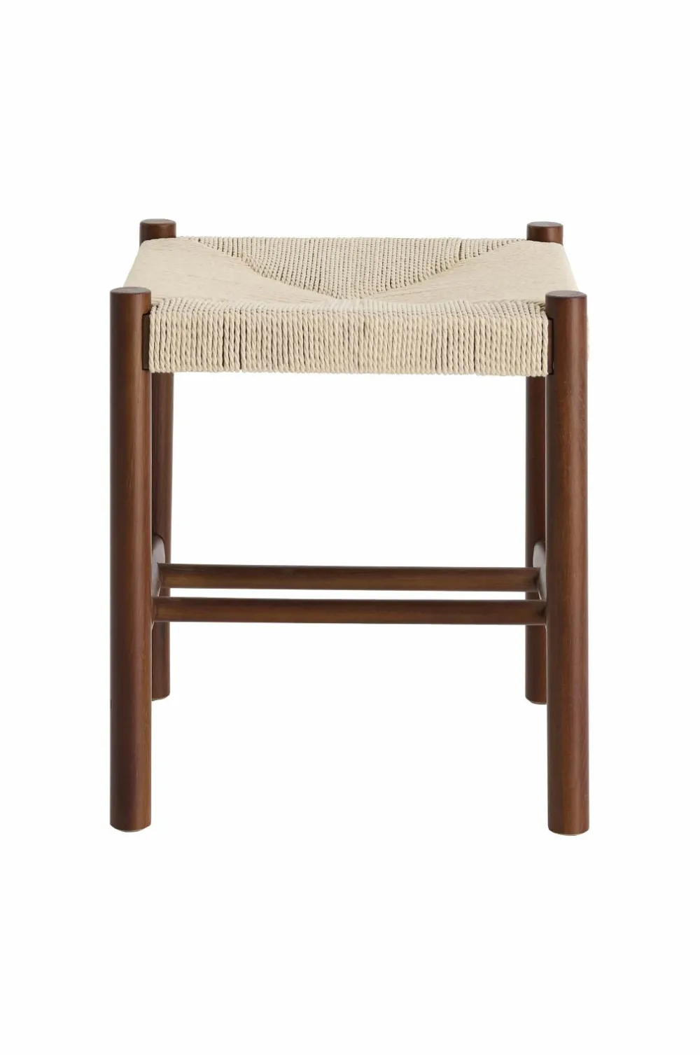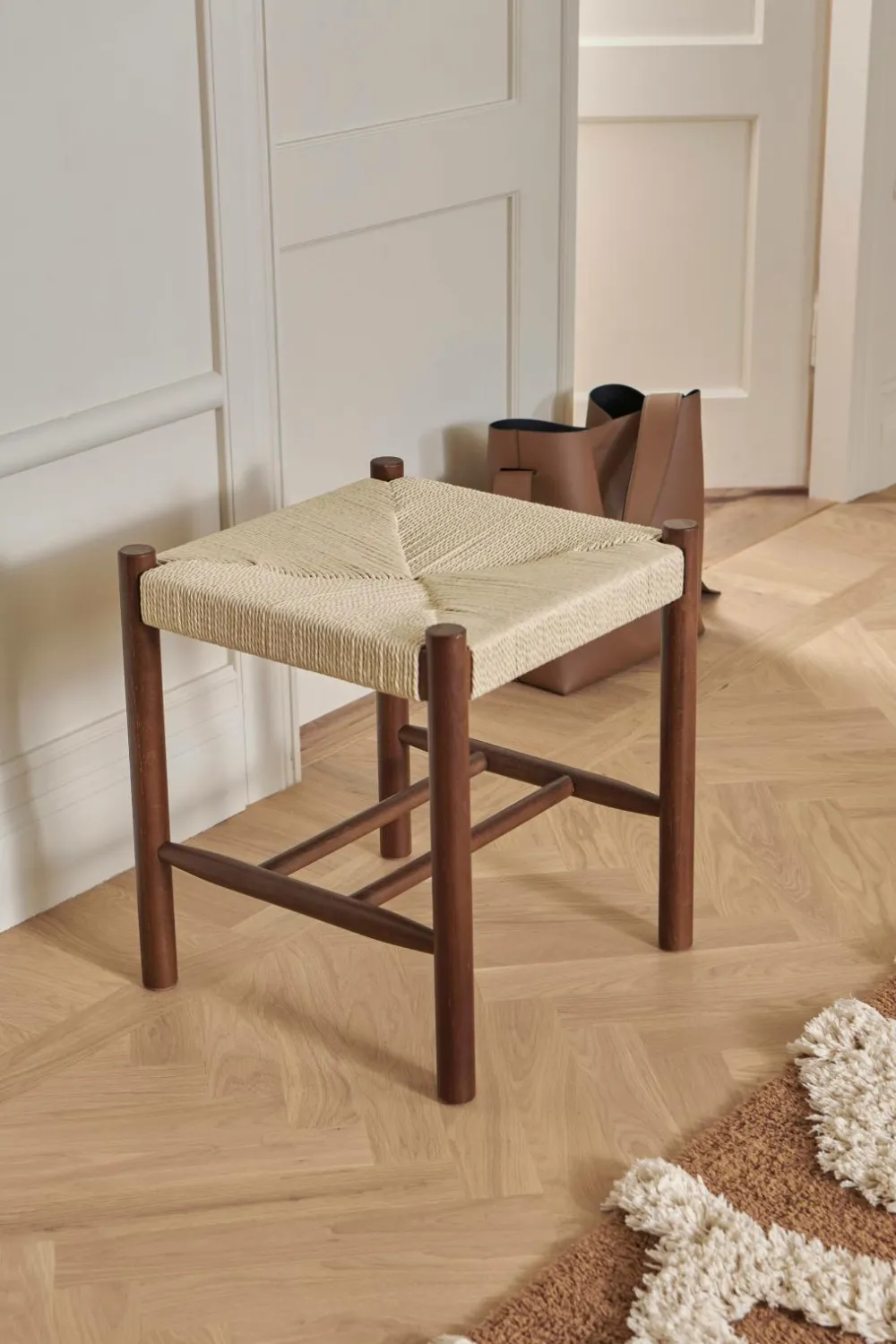 Taburet med ben og stel i massiv eg. Sæde af flettet, vokset papirsreb.