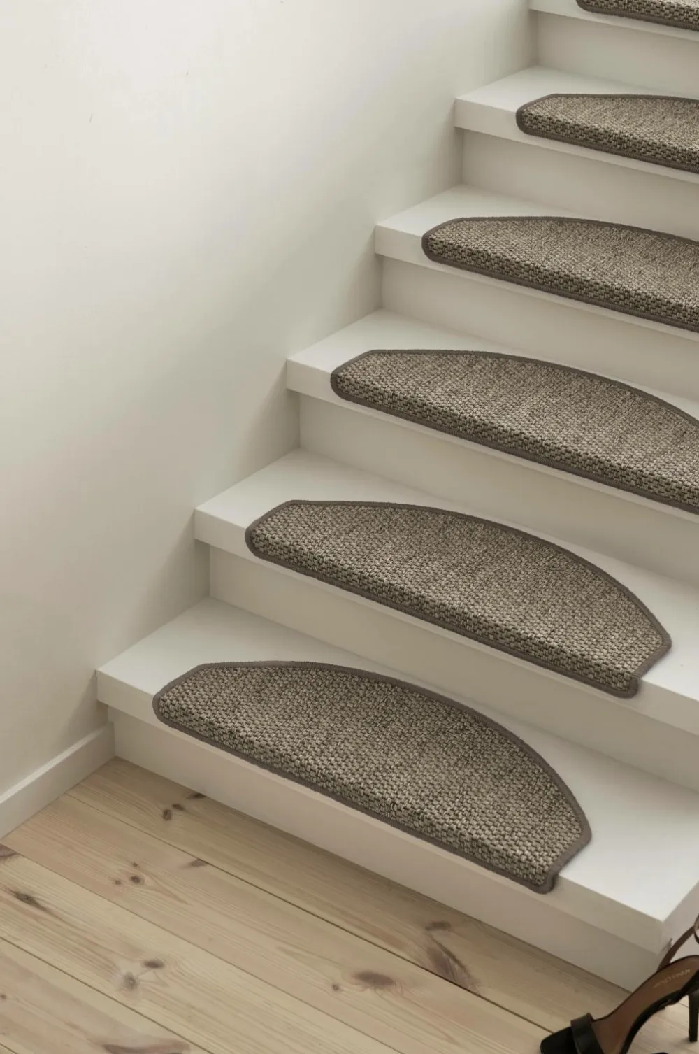 Trappetrinsmåtte i 12-pak. Vævet i sisallignende struktur med riede kanter. Bagside af hård plastprofil og dobbeltklæbende tape.