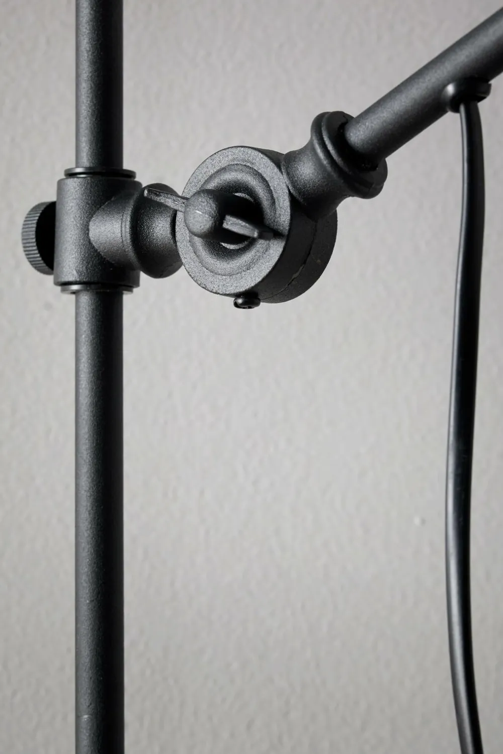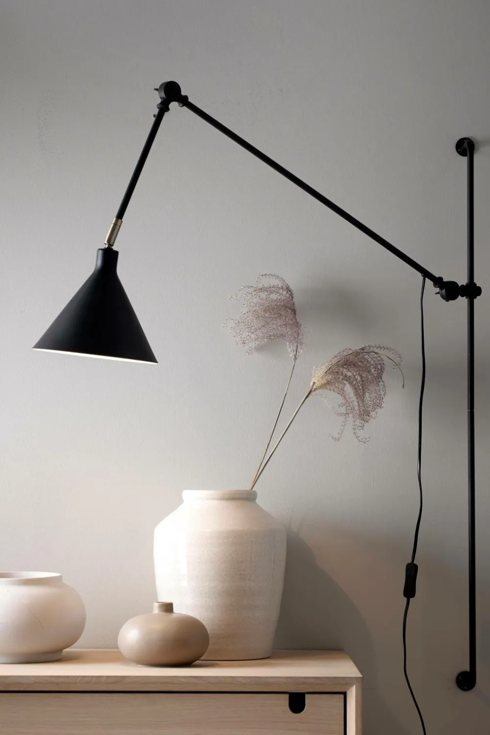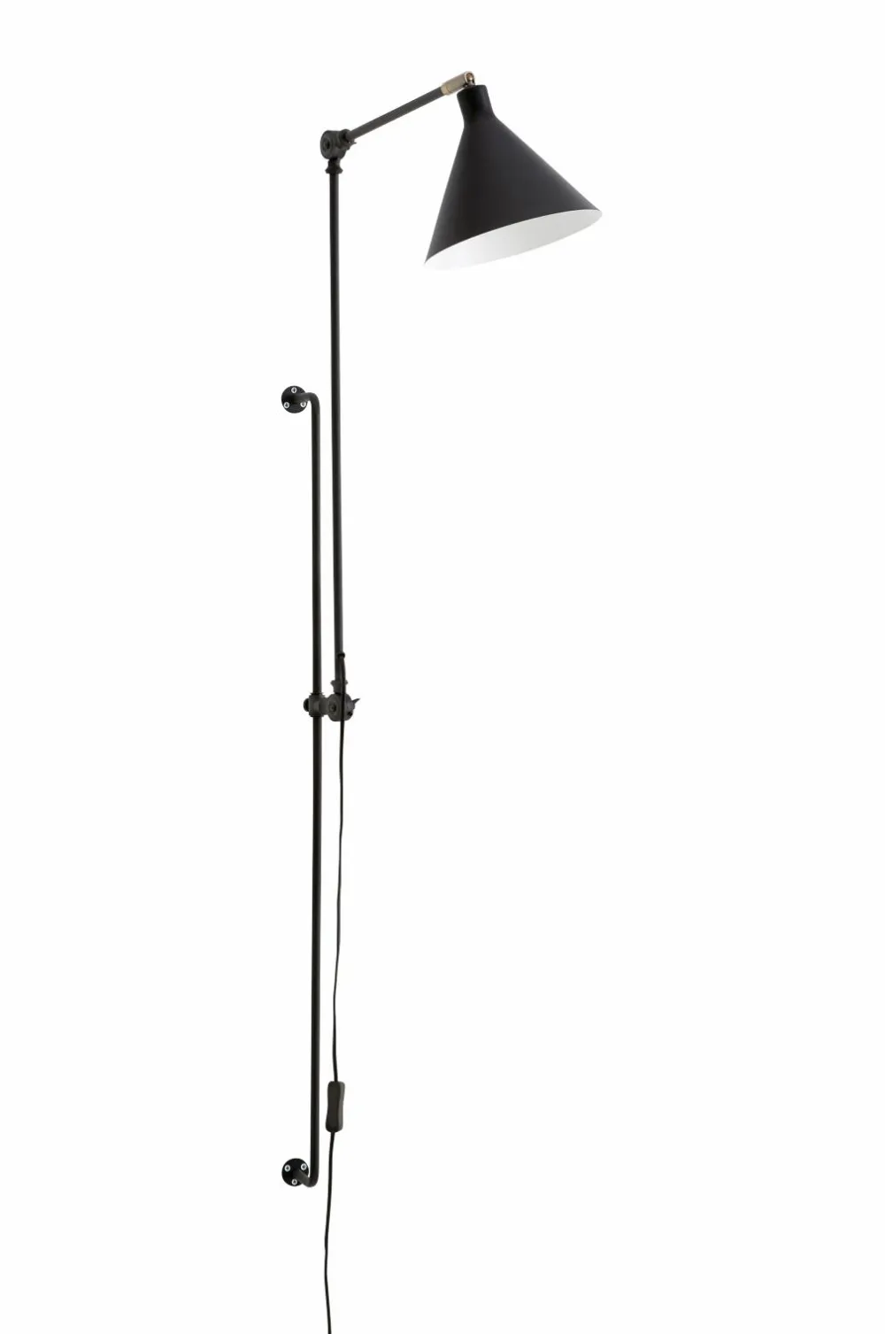 Væglampe i pulverlakeret metal, monteret på et vægbeslag med højden 100 cm. Den lange arm, som holder lampeskærmen, kan justeres opad og nedad. På den lange arm sidder en lille, justerbar arm som holder lampeskærmen. Skærmen har hvid inderside og er justerbar i højden og til siden. Hele lampen kan justeres på vægbeslaget i højden og til siden. Længde på armene er hhv. 60 og 20 cm. Mål på skærm: højde 17 cm, Ø 20 cm. Maks. totallængde fra væg 118 cm. Plastledning med afbryder, ledningslængde 2 m. Stor sokkel E27. Maks. 25 W. Pære medfølger ikke.