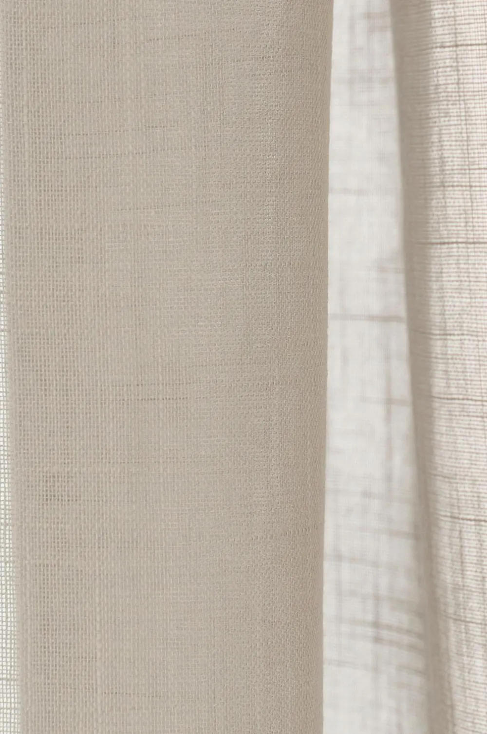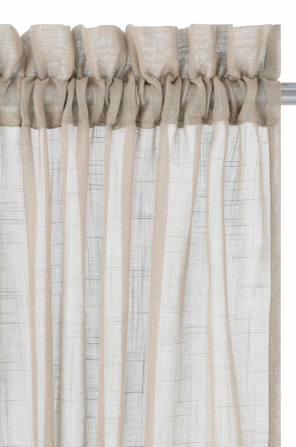 To gardinlængder med løbegang af luftig polyester med struktur i hørlook. 5 cm rynkekant. Bredde 134 cm. To længder: 220 og 250 cm.
