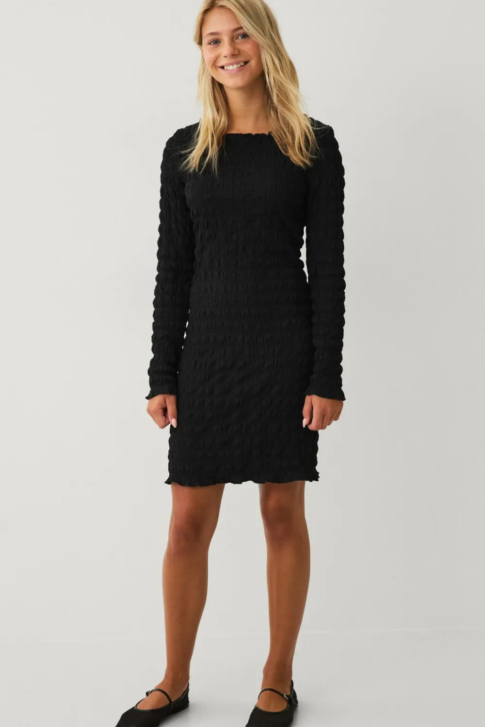 • Langærmet, figursyet kjole med smock