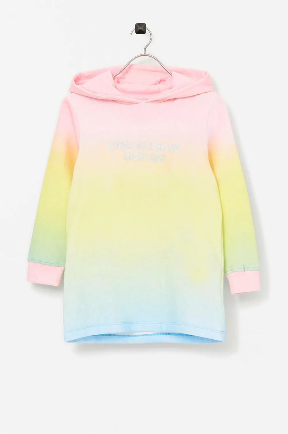 Enhjørningekjole i skønne farver med tekstprint foran og hætte med påsyede ører og horn. Ribkant i ærmekant.