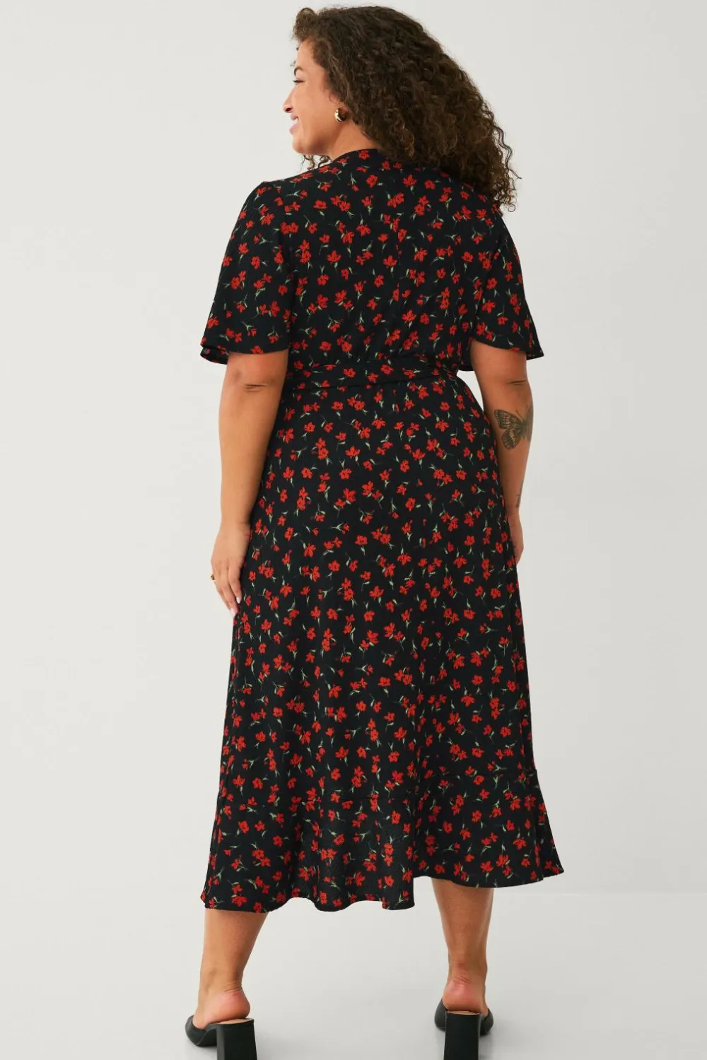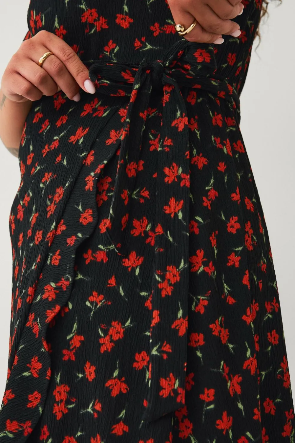 • Maxi-model i crepe med bindebånd ved taljen og elastik bagpå