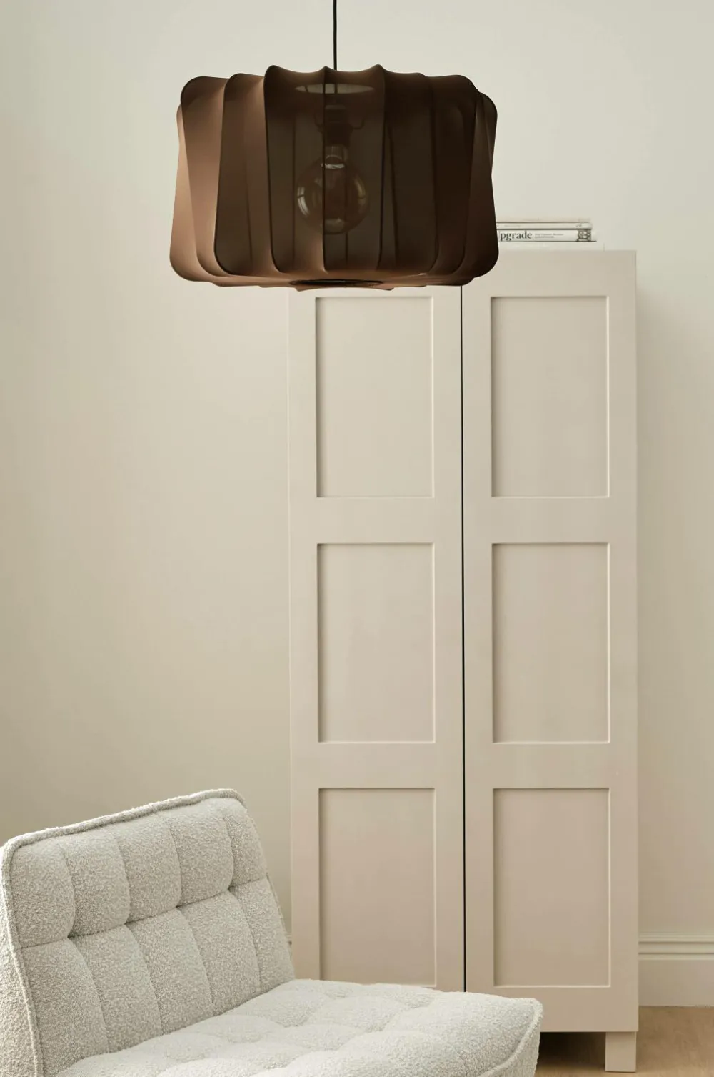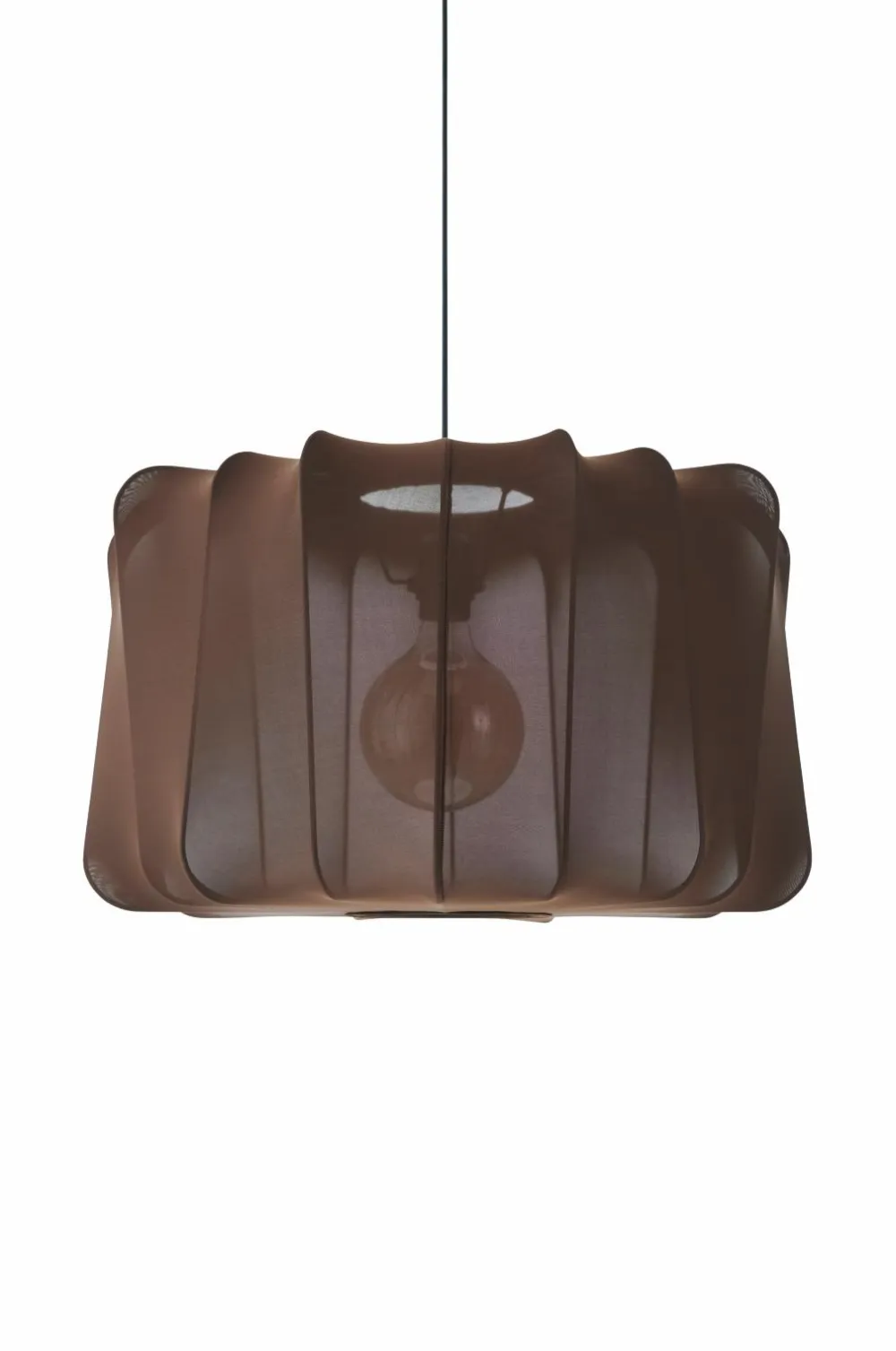 Loftlampe af let transparent stretchstof med stel af metal. Skærmens mål: Højde 31,5 cm. Diameter 55 cm. Samlet højde fra loft ca. 155 cm, kan afkortes til ønsket højde. Ledning og baldakin af plast. Krogophæng. Pære medfølger ikke.