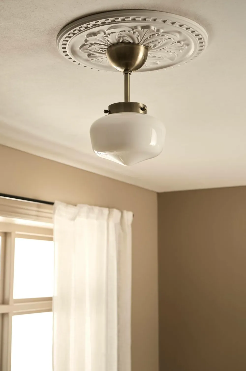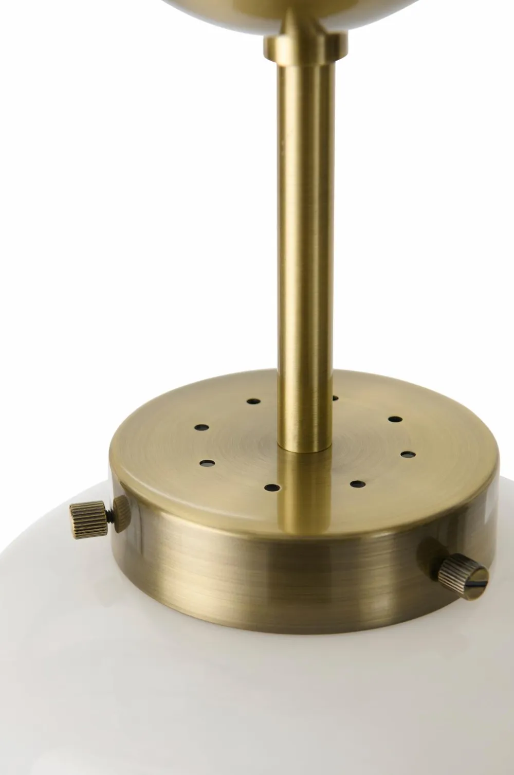 • Loftplafond i glinsende, opalhvid glas med detalje i messingfarvet metal