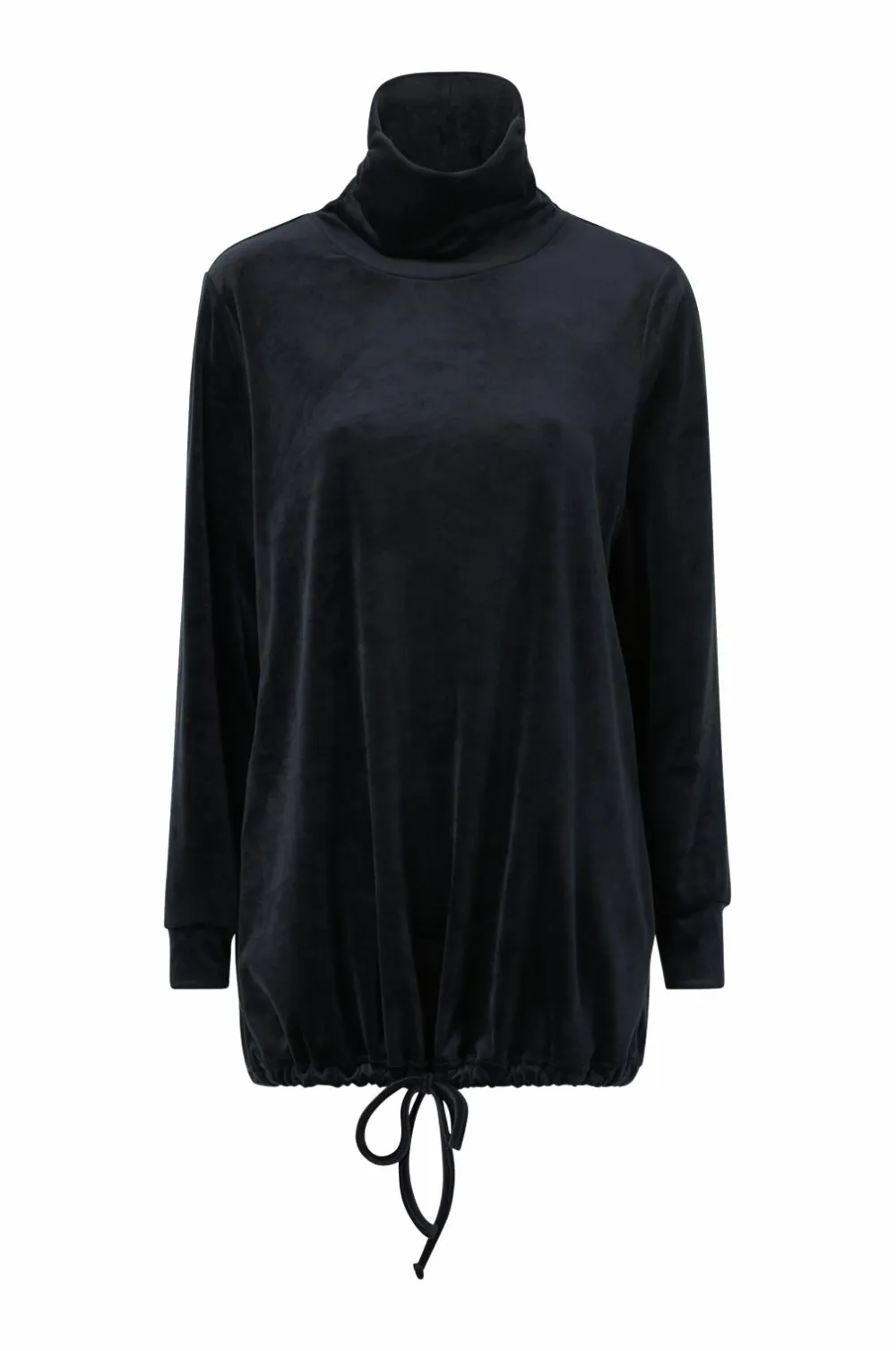 Blød og skøn tunika i skinnende velour. Høj rullekrave og justerbar kant forneden med løbegang. Rib i ærmekanten. Længde ca. 80 cm i str. 38/40.
