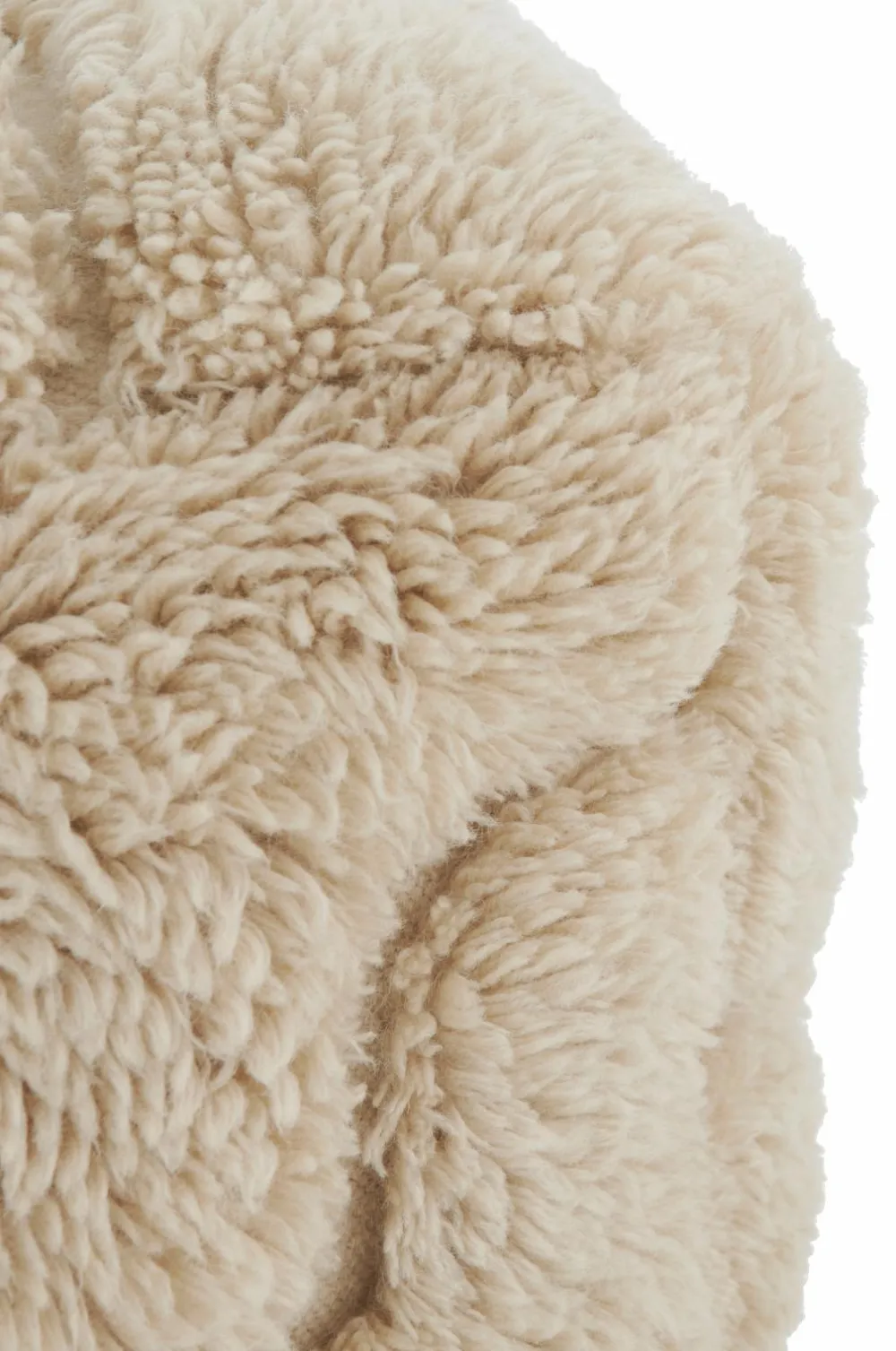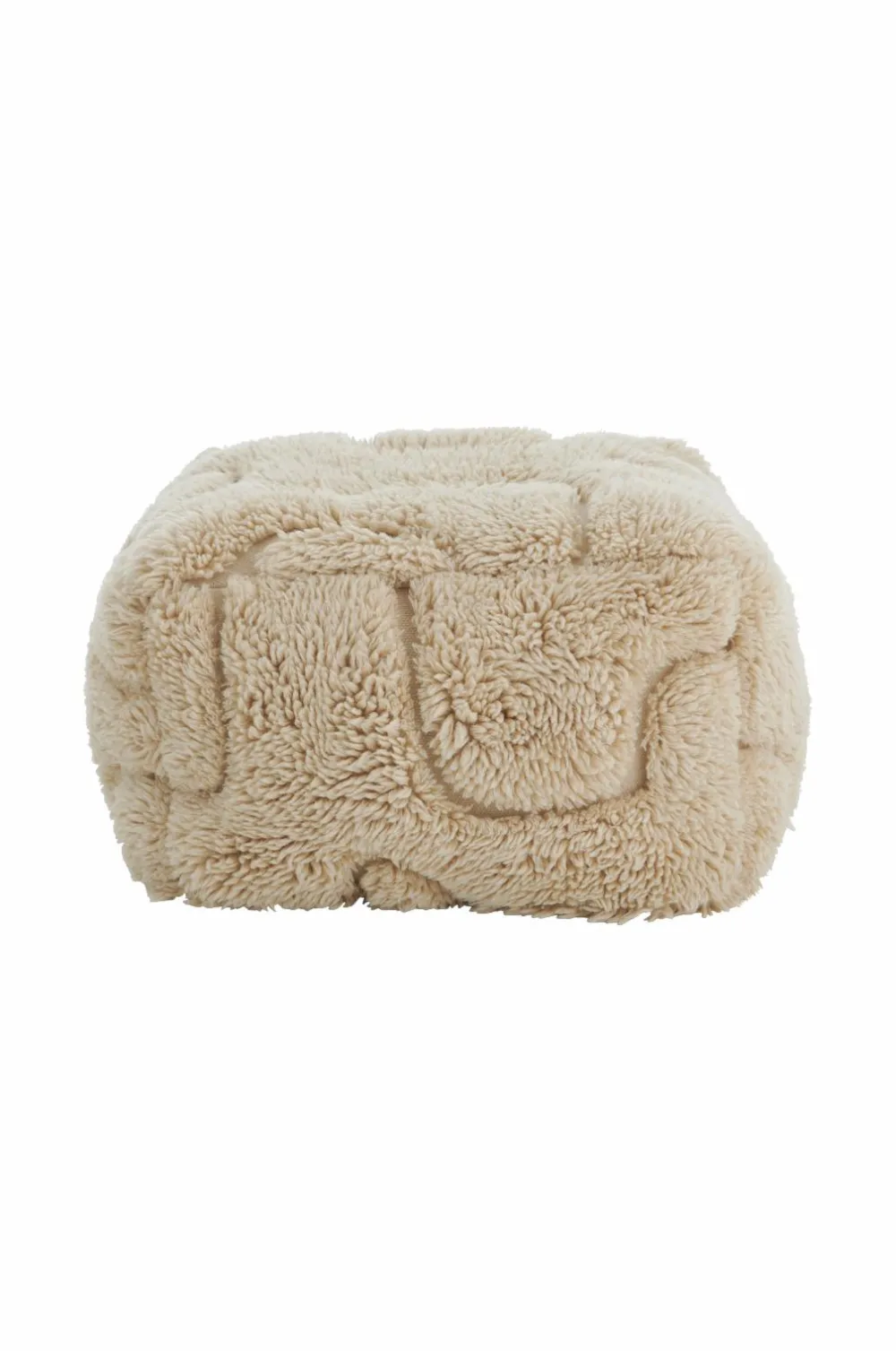 Puf af uld med tuftet, ryalignende mønster. Luvhøjde: 3,5 cm. Aftageligt betræk. Bund af bomuld. Fyld af plastkugler (thermocol).