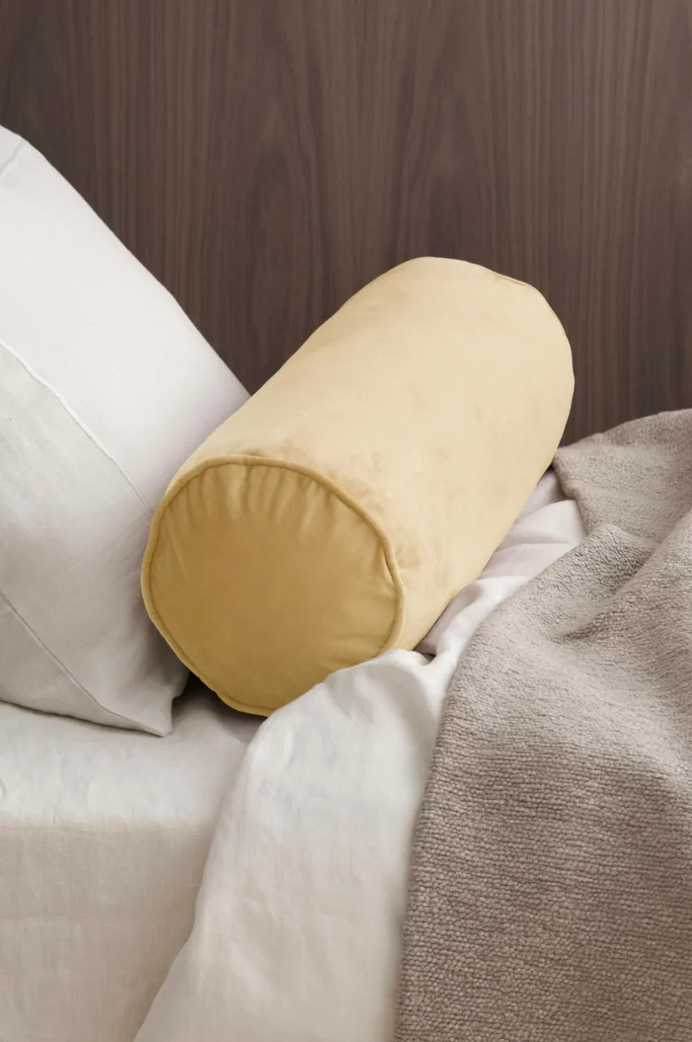 Cylinderformet pude i velour med monteringspude i polyester. Paspoleret kant i enderne. Af genindvundet polyester. Lynlås på undersiden. Bredde 55 cm, diameter 18 cm.