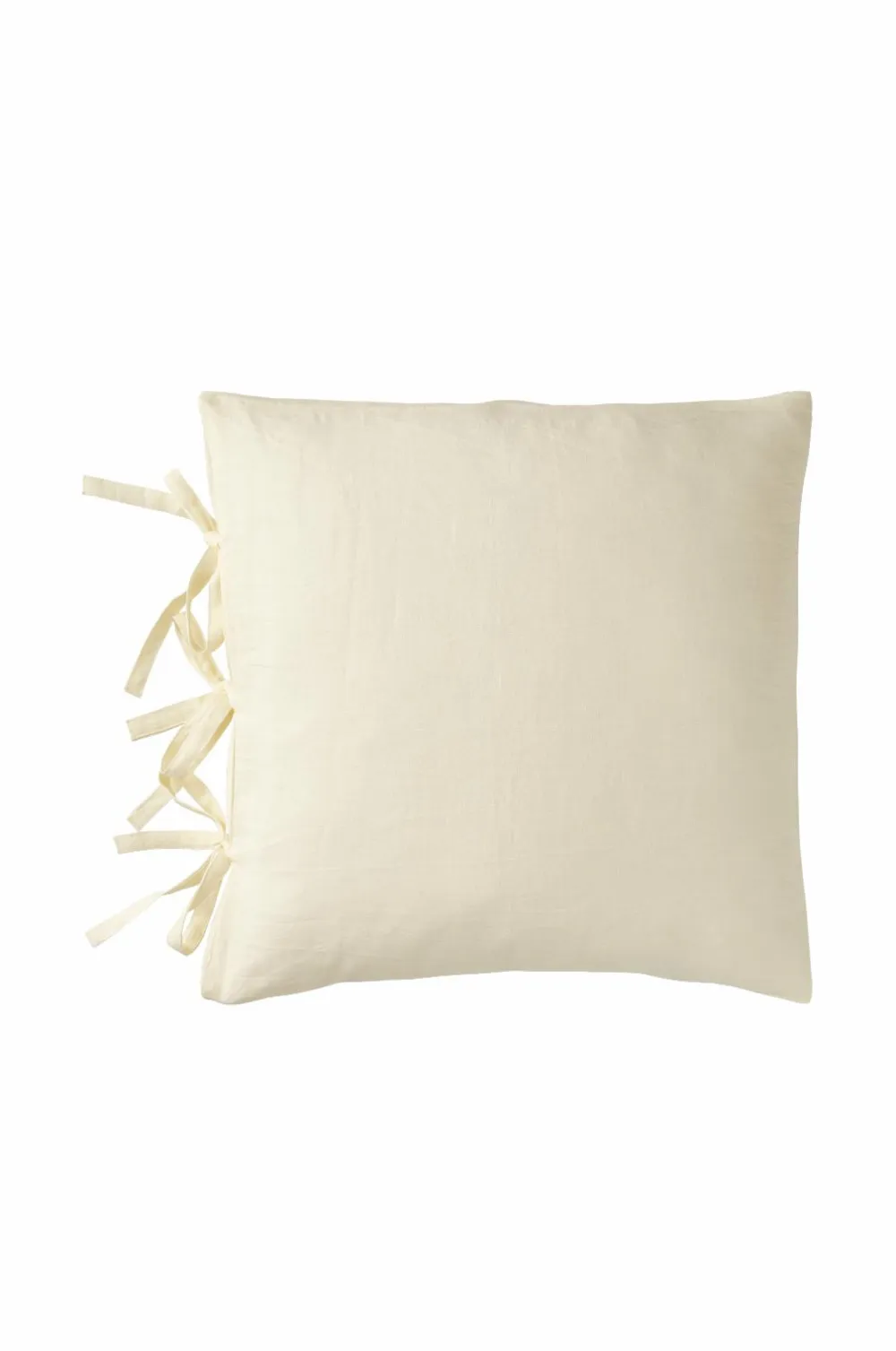 Pudebetræk i blød, vasket hørkvalitet med vintagelook. Af fransk hør. Tre par bindebånd i den ene kant. Str. 50×50 cm.