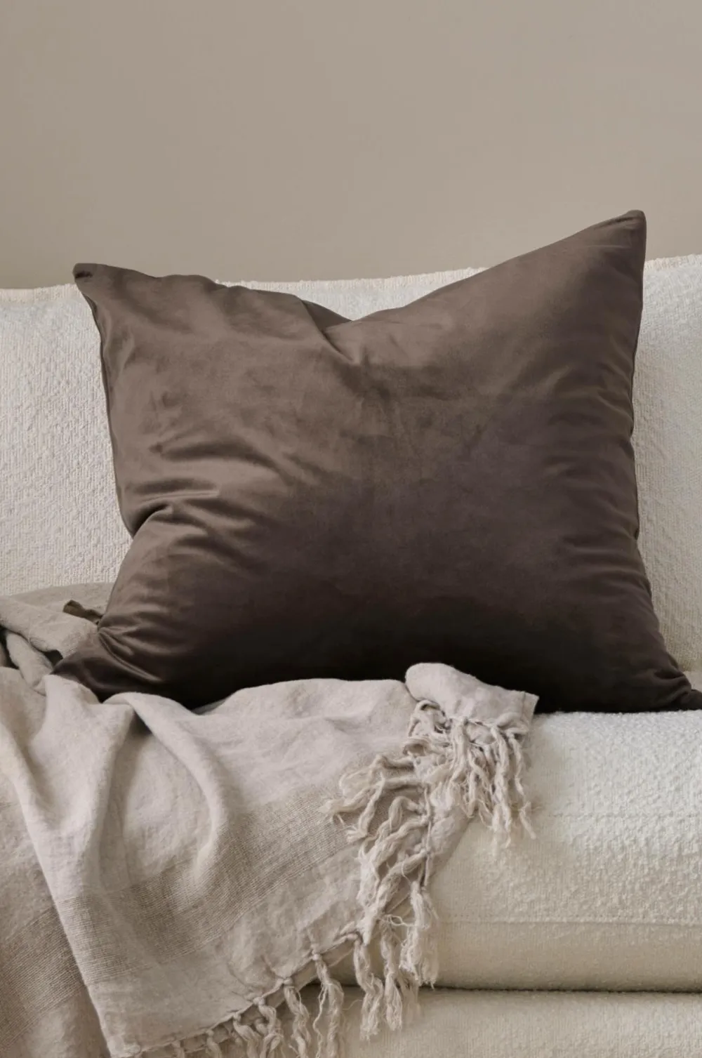 Pudebetræk af velour med fin glans. Af genindvundet polyester. Lynlås i bunden.