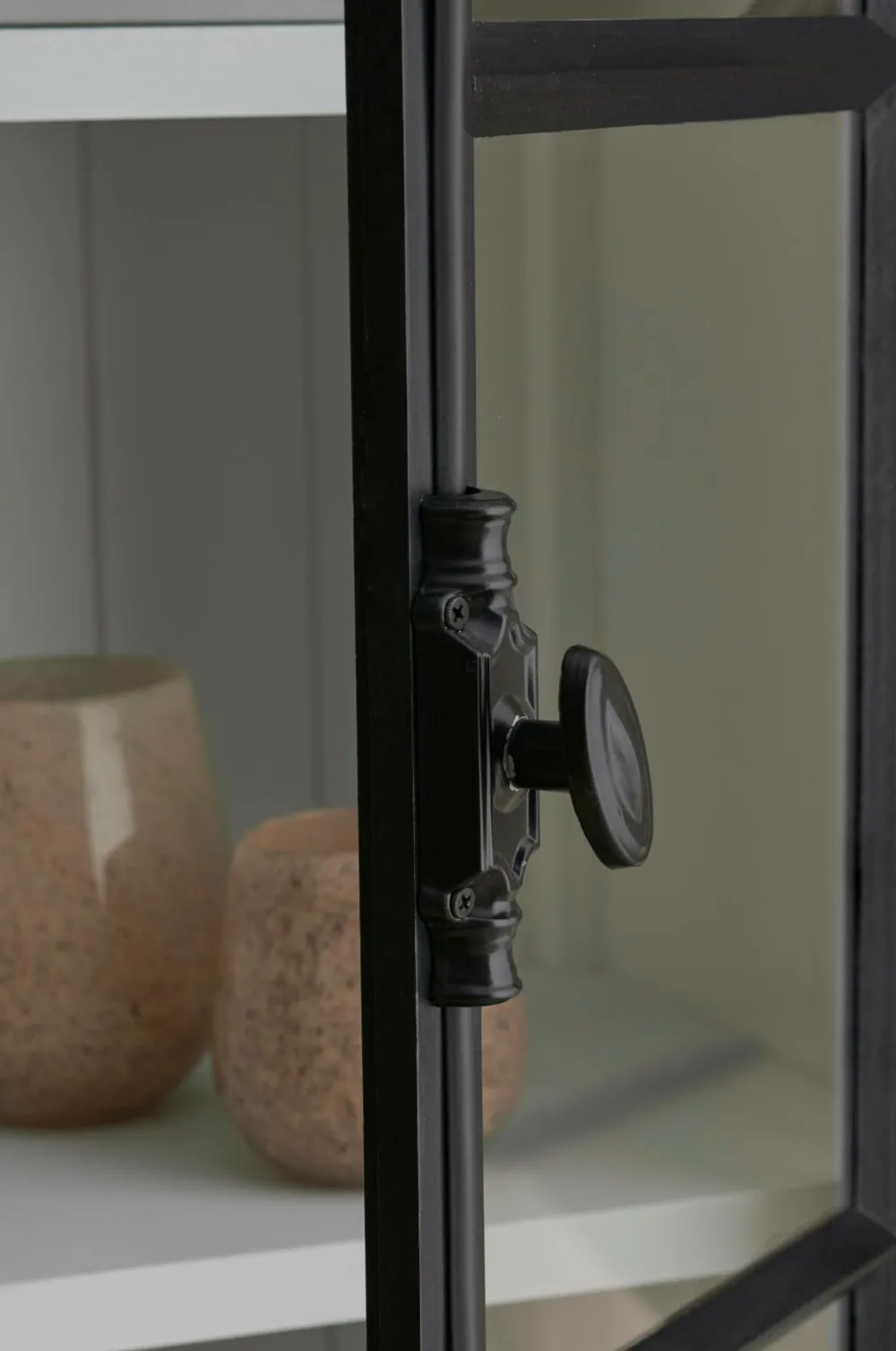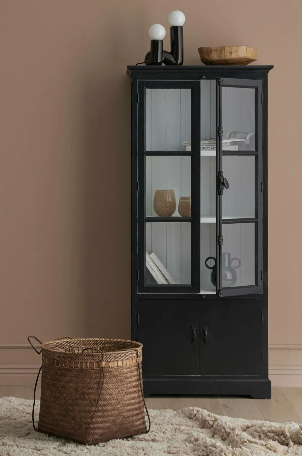 Skab med vitrinelåger og drejehåndtag. Bagstykke og bund af gran. Sidepaneler, overdel og hylder af MDF. Låger af MDF og glas, tykkelse 3 mm. 2 faste hylder af træ. Underskab uden hylder. Højde 180 cm. Dybde 40 cm. Bredde 80 cm. Maksimal belastning pr. hylde 20 kg. Lev. monteret.