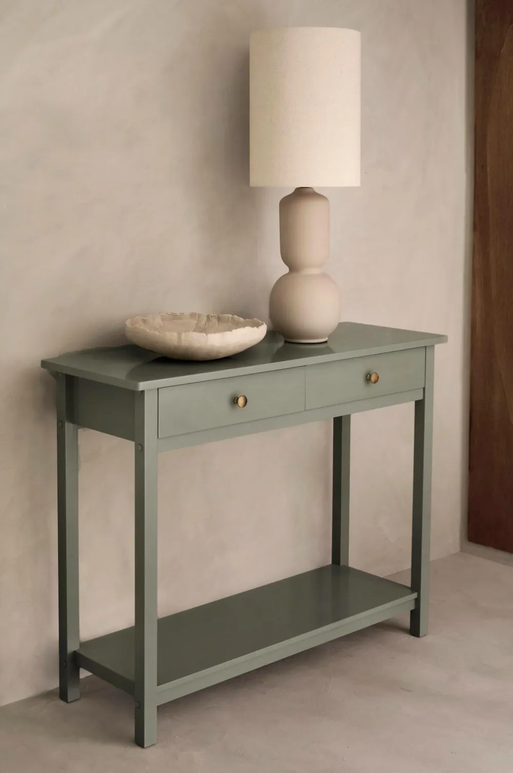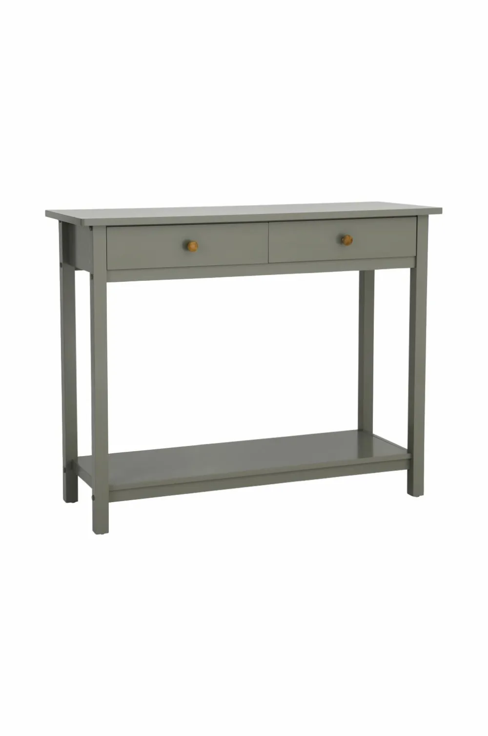 Skænk i massiv fyr og MDF. To små skuffer. Højde 82,5 cm, bredde 104 cm, dybde 37 cm. Højde fra gulv til hyldeflade 7 cm. Lev. usamlet.