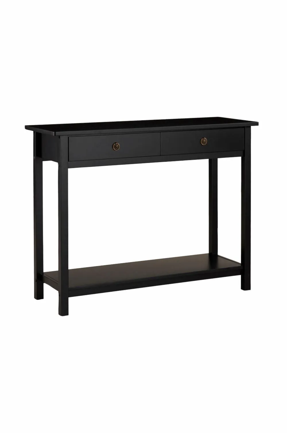 Skænk i massiv fyr og MDF. To små skuffer. Højde 82,5 cm, bredde 104 cm, dybde 37 cm. Højde fra gulv til hyldeflade 7 cm. Lev. usamlet.