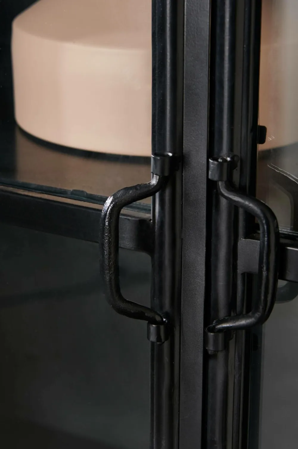 Hvælvet skab i metal. To låger med metalramme og hærdet, klart glas. Lågerne har magnetstop. 4 faste hylder i metal. Maks. vægt 10 kg/hylde. Hul på bagsiden til montering på væggen. Mål: Bredde 100 cm, højde 197 cm, dybde 40 cm. Benhøjde 26,5 cm. Hyldens indvendige mål 37 cm x 97 cm. Ca. 37 cm mellem hylderne. Leveres samlet.
