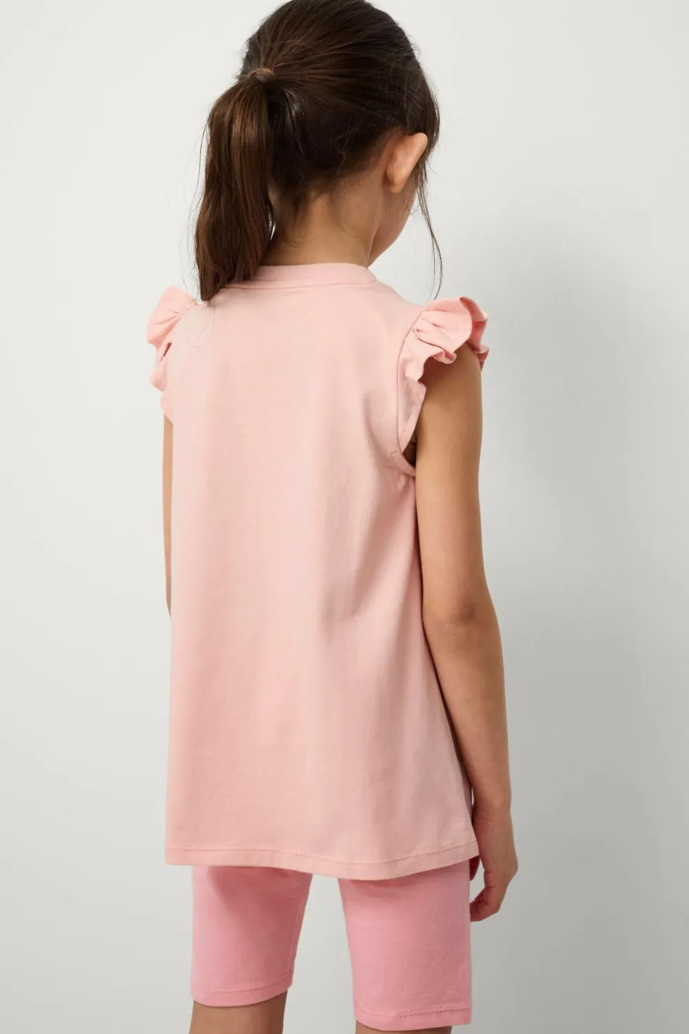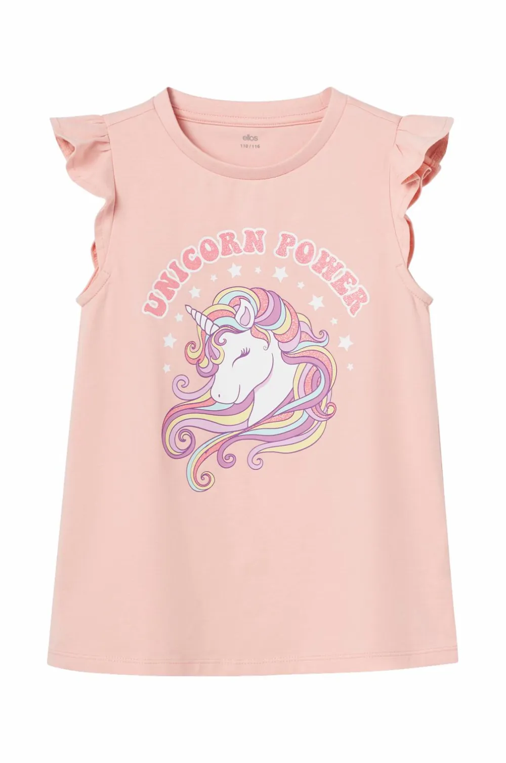 • Ærmeløs top med tryk foran og volanter på skuldrene