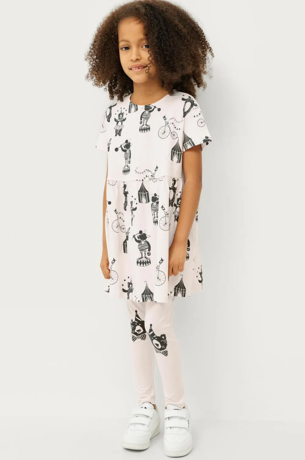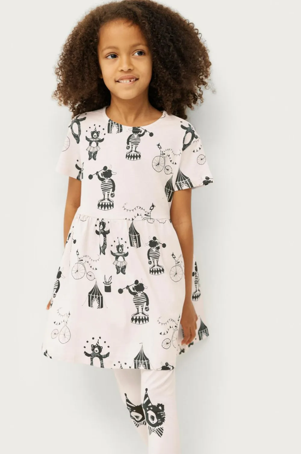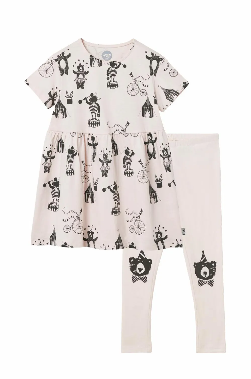 Todelt sæt i blød jersey af økologisk bomuld. Kortærmet kjole med rund halsudskæring og printet mønster. Elastik i taljen med rynkning. Leggings med elastisk talje og printede detaljer.