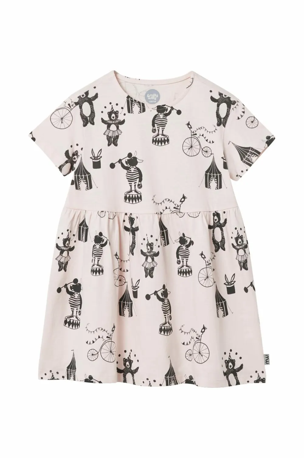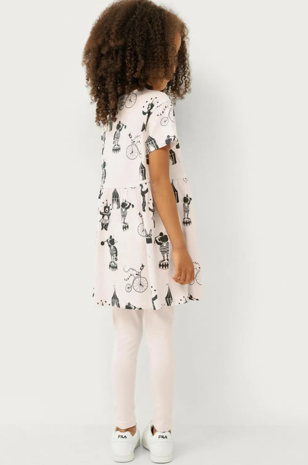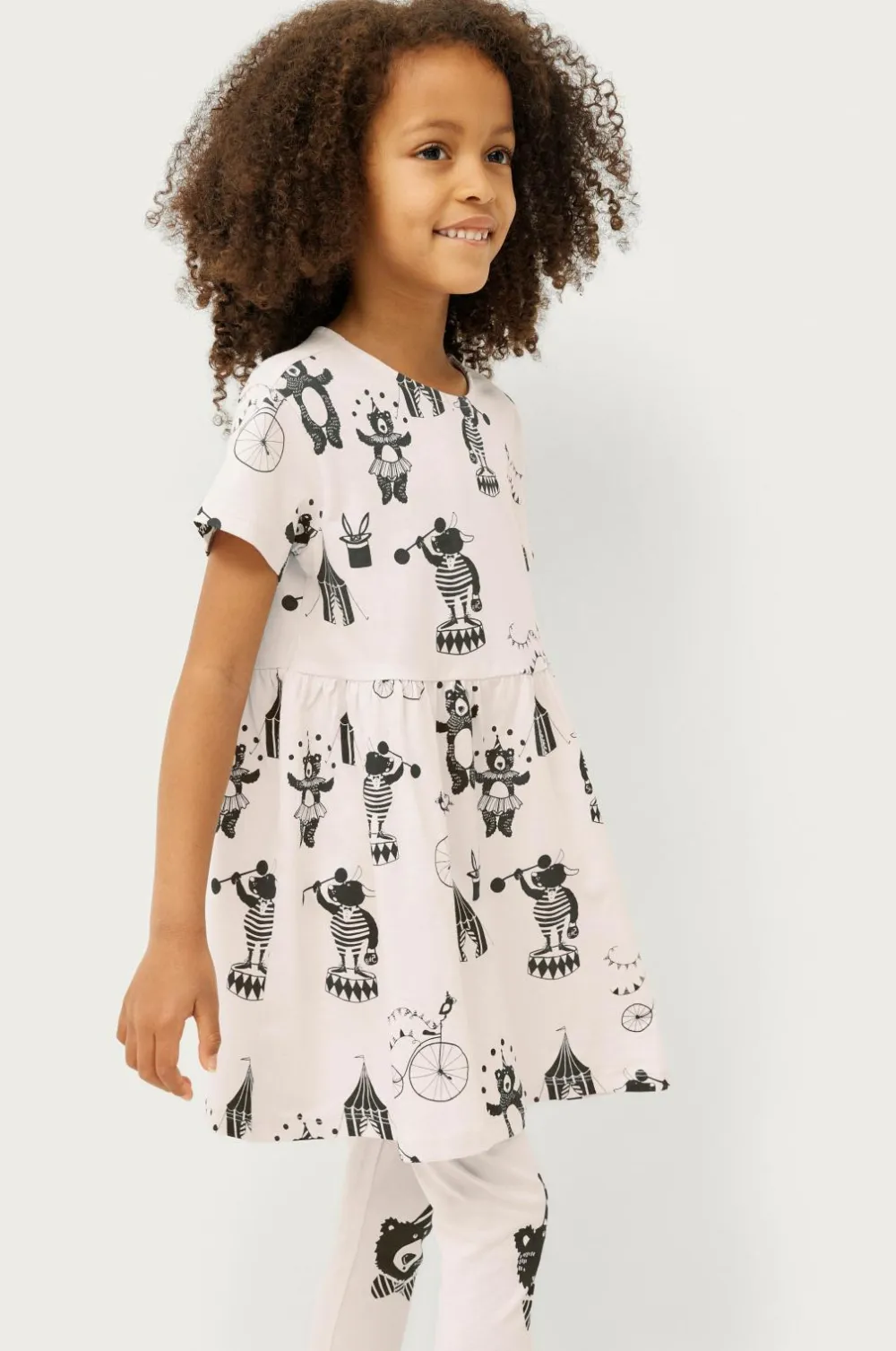 Todelt sæt i blød jersey af økologisk bomuld. Kortærmet kjole med rund halsudskæring og printet mønster. Elastik i taljen med rynkning. Leggings med elastisk talje og printede detaljer.