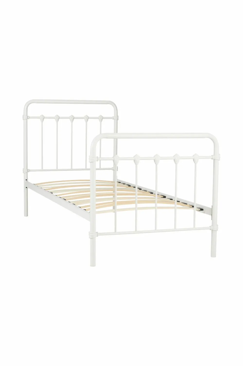 i industriel stil. Fremstillet i metal med lamelbund i træ. Madrasmål 90×200 cm. Ydermål 98×208, højde hovedgavl 115, fodgavl 91 cm. Afstand mellem gulvet og sengens nederste kant 29 cm. Afstand mellem stængerne 10 cm. Beregnet til polyeter- eller springmadras. Maks. vægt 120 kg.