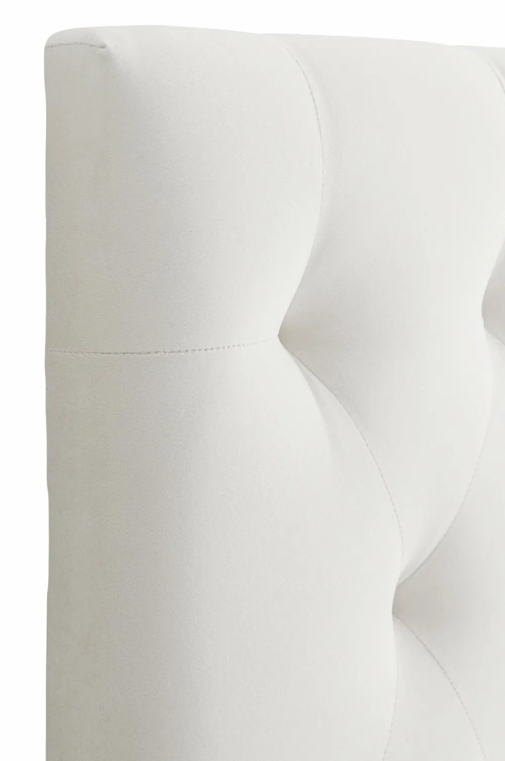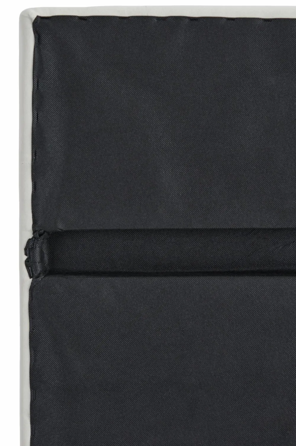 Polstret sengegavl som fastgøres på væggen (to kroge på bagsiden). Stel af fyrretræ og plywood. Betræk i velour af polyester og fyld af polyeter.