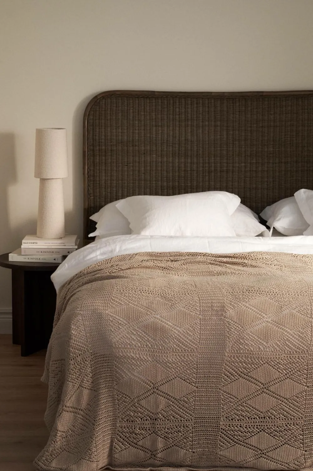 Hovedgavl i rotting med tætvævet top og dekorativ kant. Gavlen stilles på gulvet. Bredde 160 cm, højde 137 cm, dybde 4 cm. Benhøjde 24 cm.
