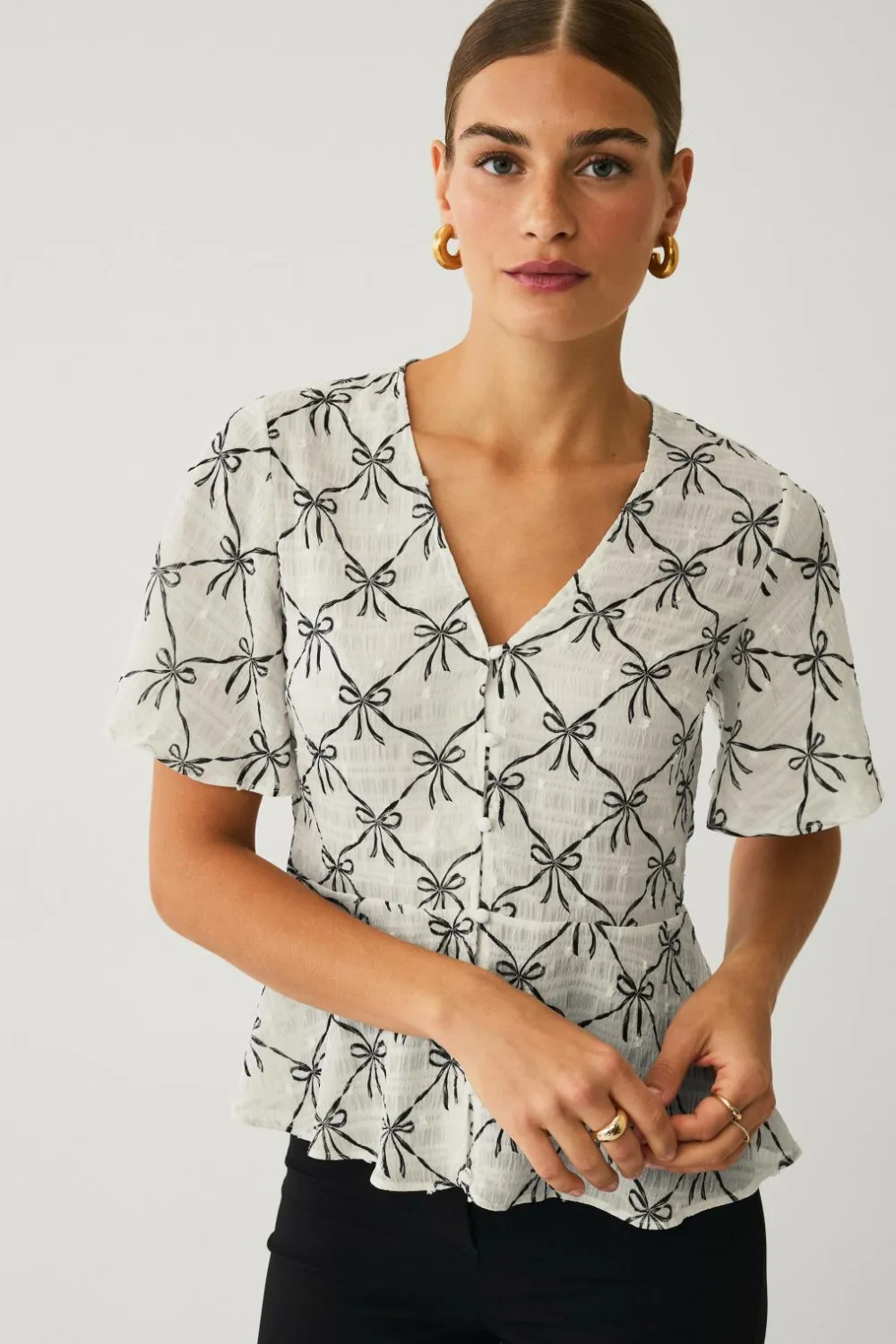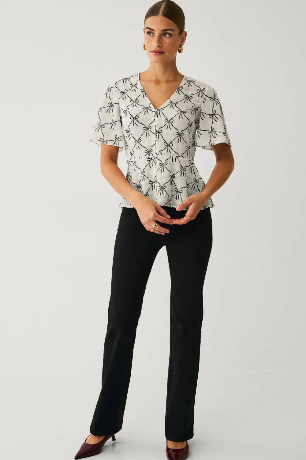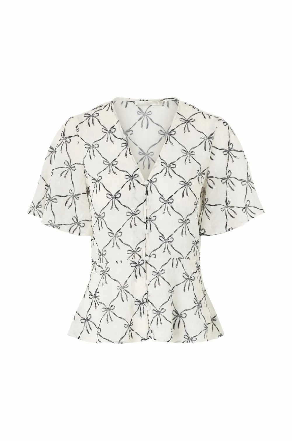 • Bluse med korte, flæsede arme og v-formet halsudskæring