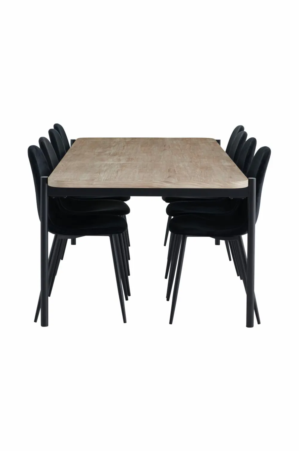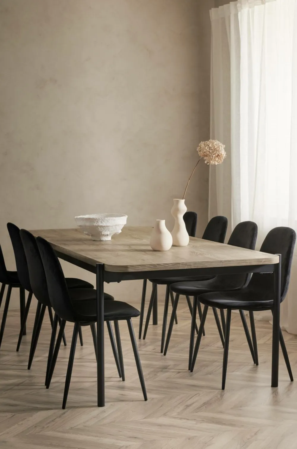 Spisegruppe med bord og otte stole. Bordet har pulverlakerede metalben og en plade i folieret MDF.