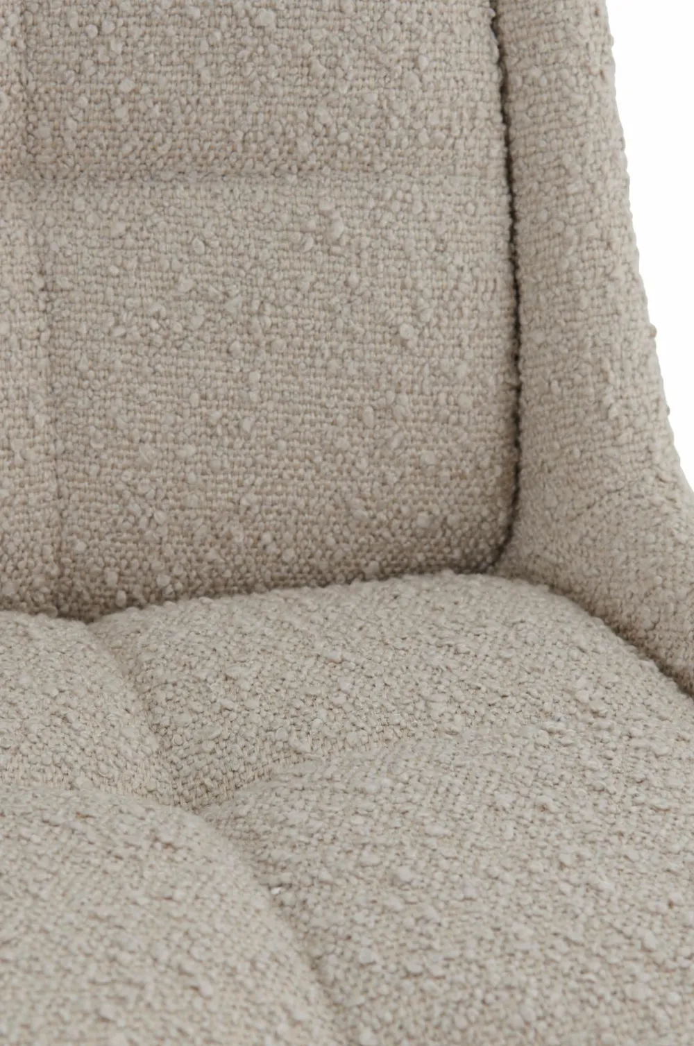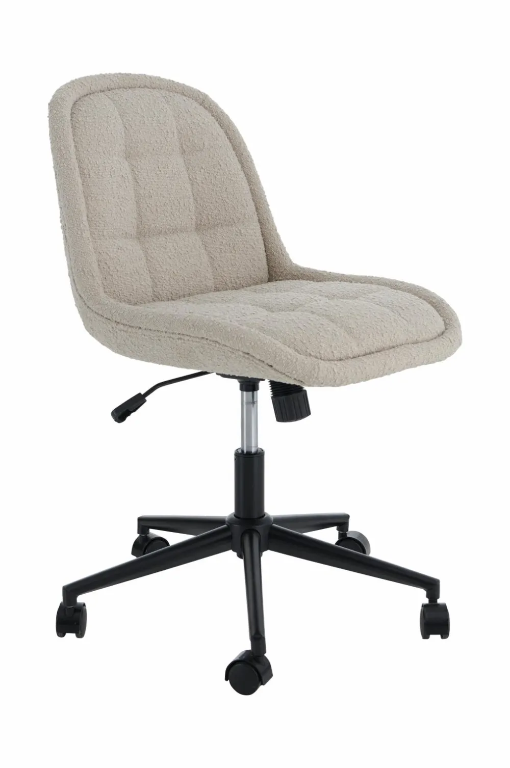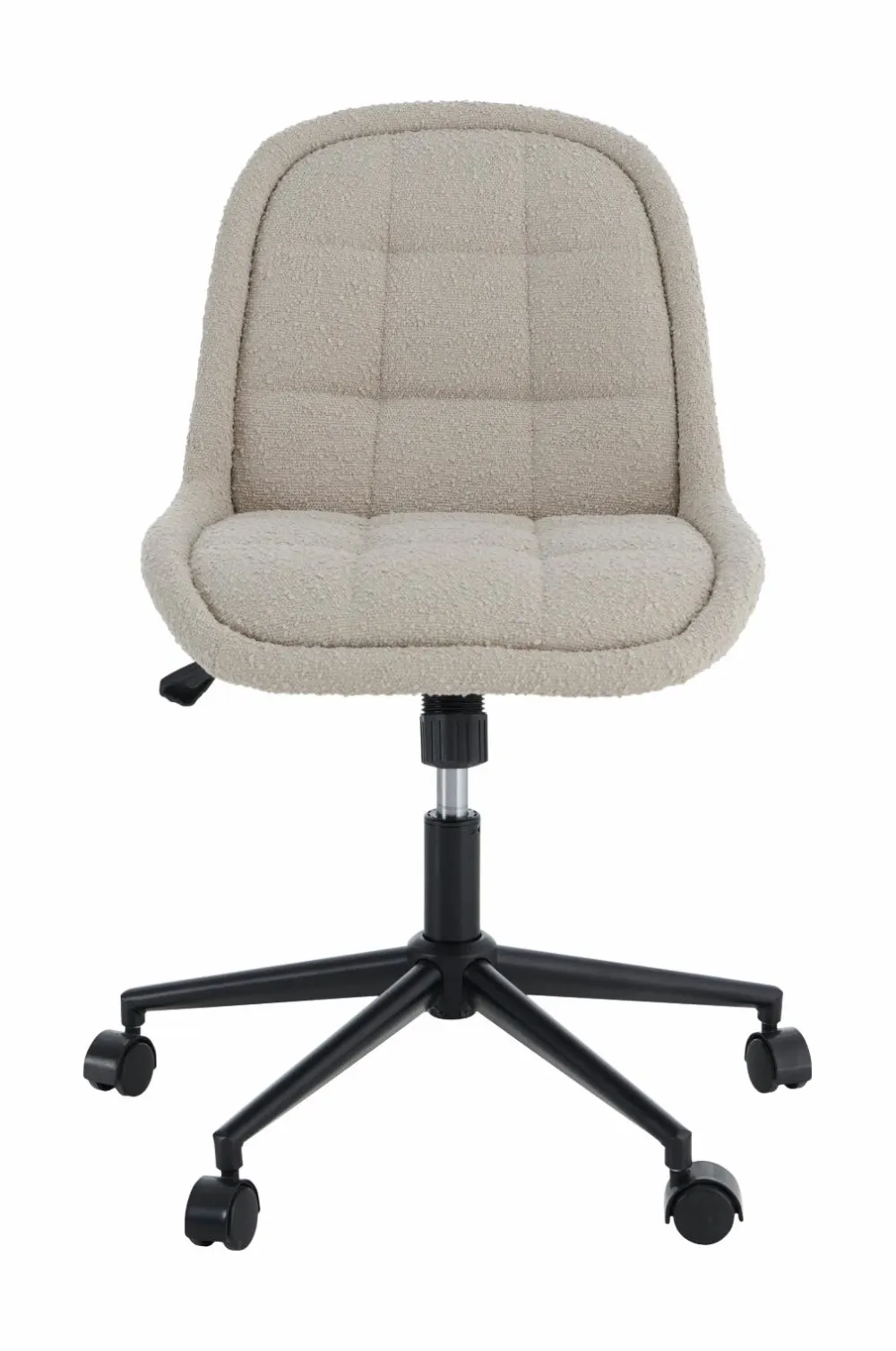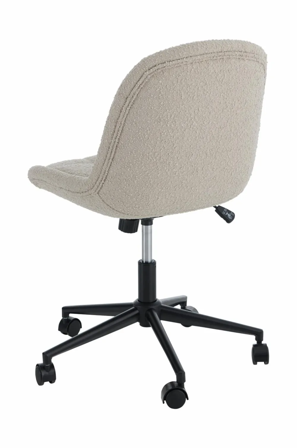 Kontorstol/skrivebordsstol med vatteret sæde og betræk i boucléstof. Ben i pulverlakeret metal med hjul. Vippemekanisme og drejefunktionsplade.