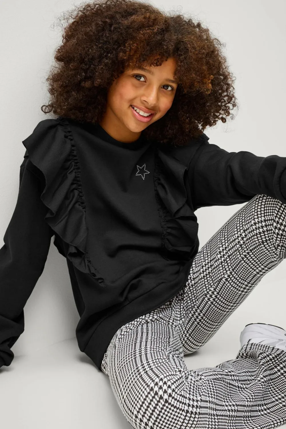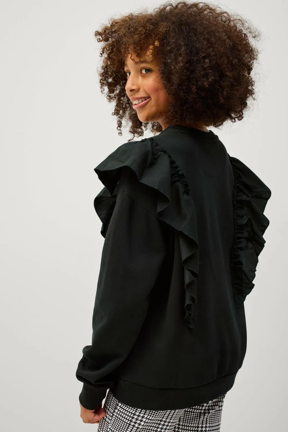 • Vævede, påsyede volanter omkring skuldrene, ved fronten og bagpå