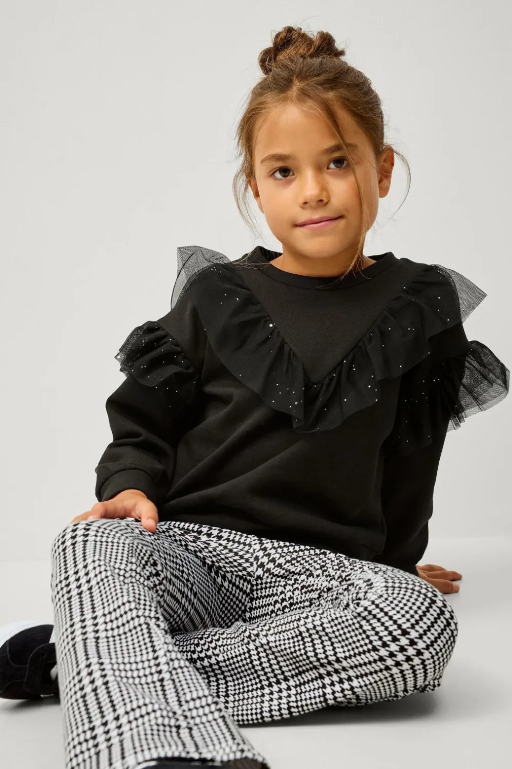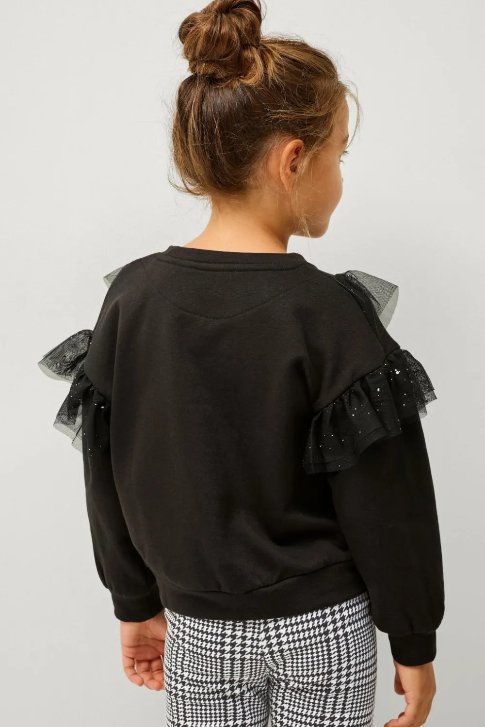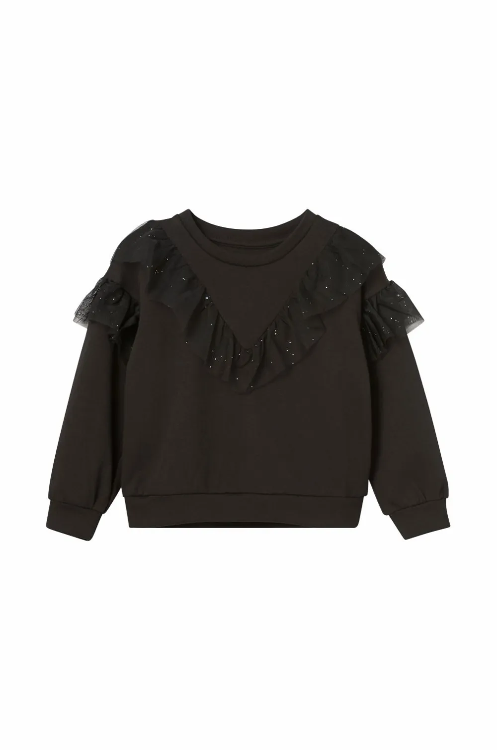 • Glitrende volanter i mesh foran og omkring ærmerne
