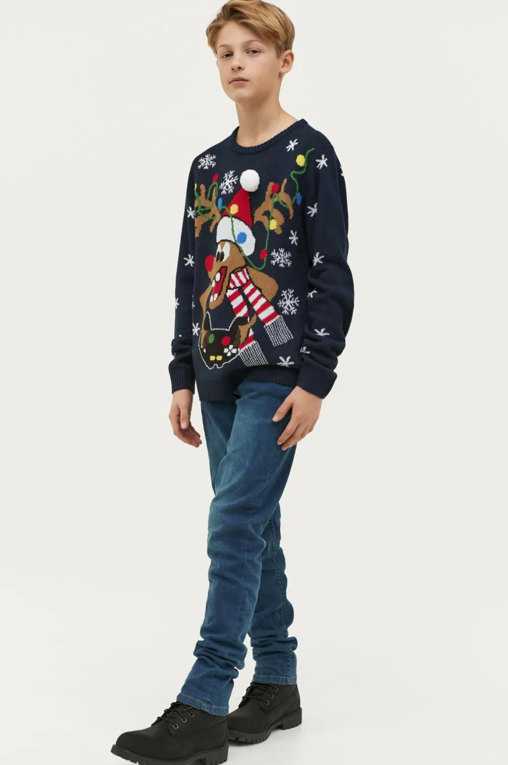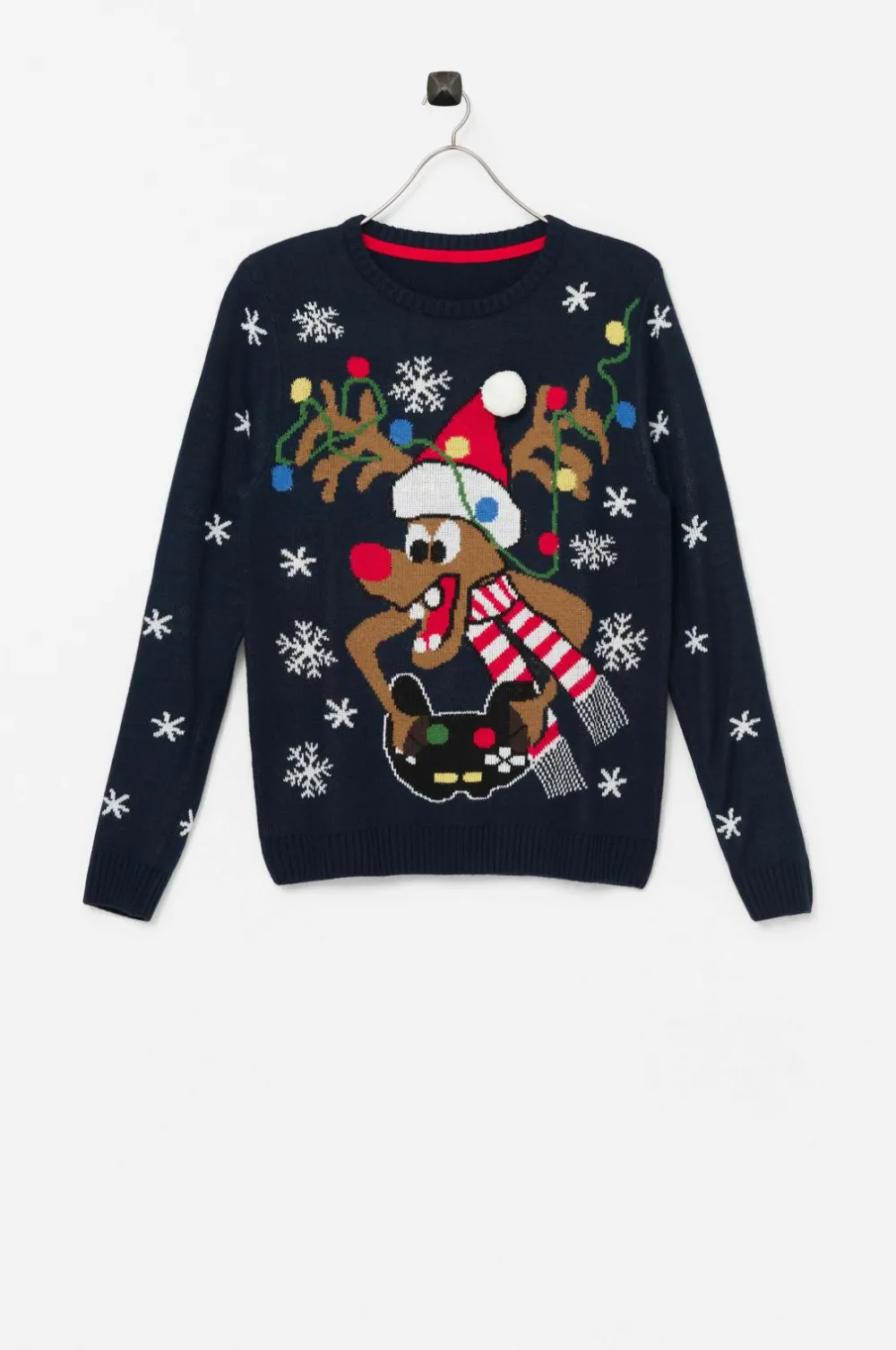 Juletrøje Christmas i blød, strikket kvalitet med julemotiv. Ribstrikket kant forneden, i ærmekant og hals.