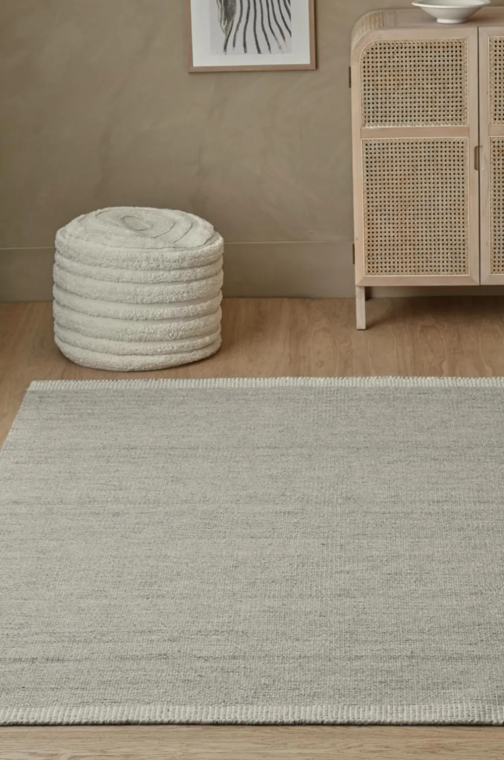 Håndvævet uldtæppe i meleret look. Stribet kant i enderne.