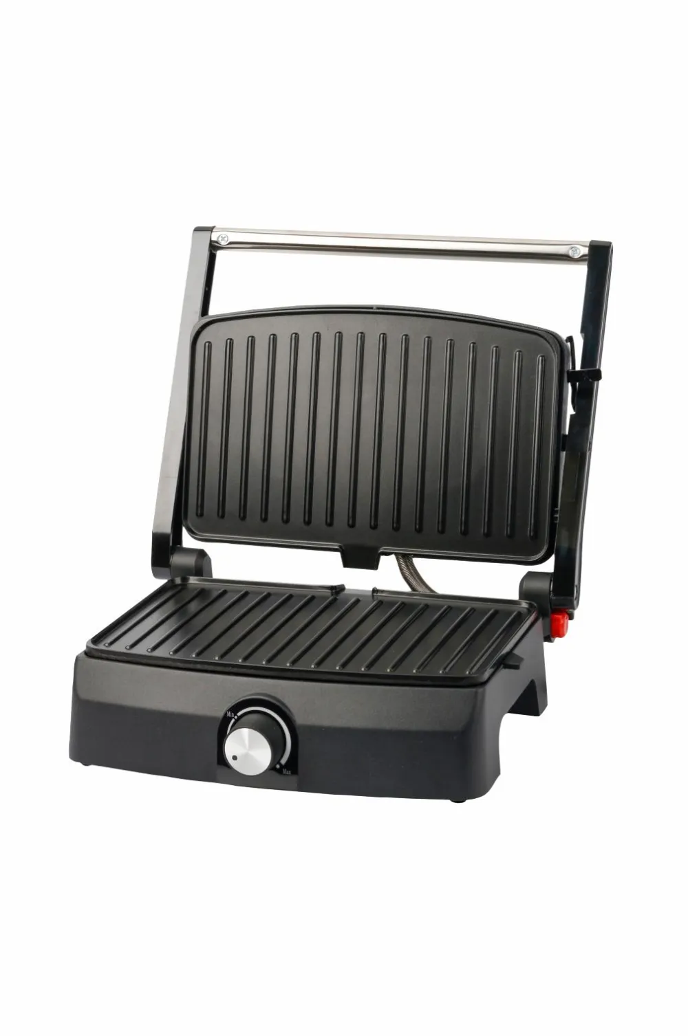 kontaktgrillen er elegant i sort og sølv og smart designet med et bevægeligt låg, der kan åbnes 180 grader, og som tilpasser sig madens tykkelse. Temperaturen på grillen kan justeres, et lys indikerer varmen, og den er nem både at bruge og rengøre.