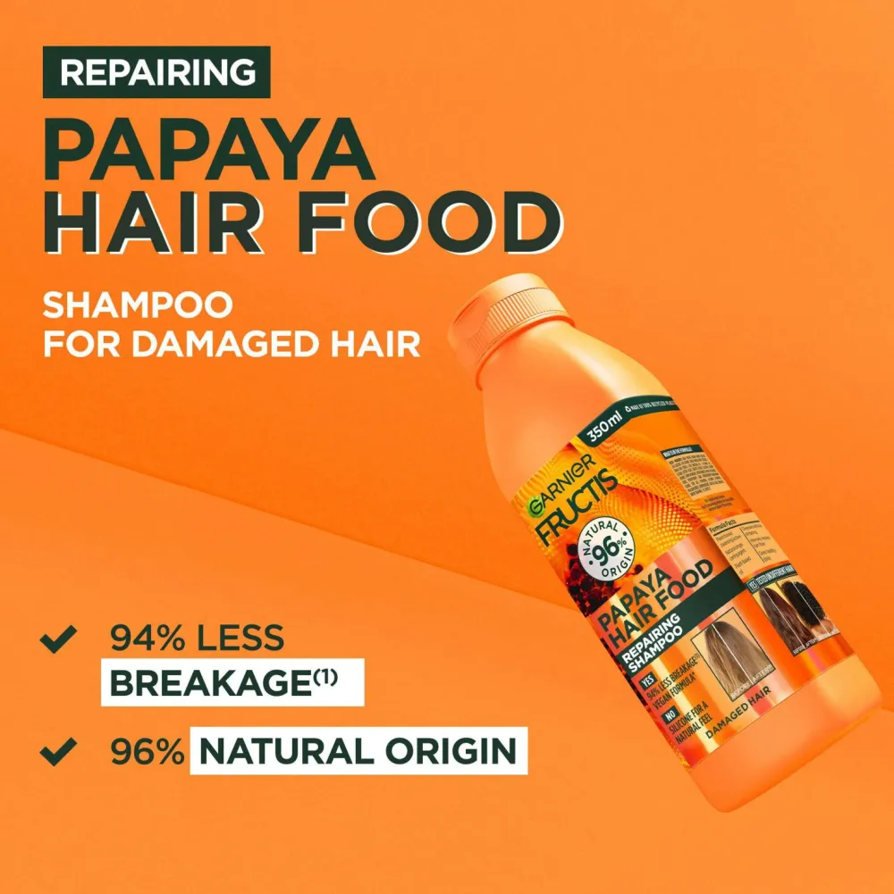 Garnier Fructis Hair Food Papaya Repairing Shampoo til skadet hår reparerer intenst hårfiberen for at modvirke at dit hår knækker* samtidig med at den renser håret og giver en sund glans. Den veganske** formel er uden silikone for en naturlig følelse og er beriget med plantebaserede olier samt plejende ingredienser af naturlig oprindelse.