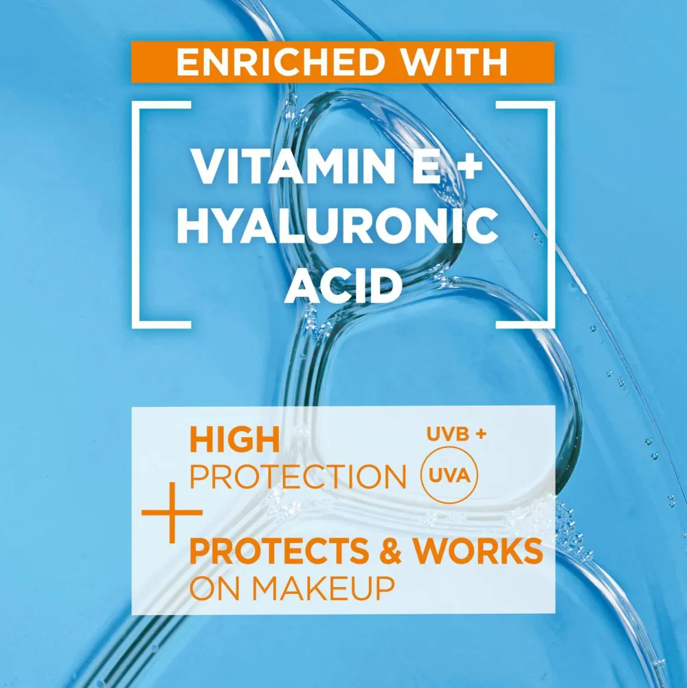 Beskyt og fugt din hud med en behagelig solbeskyttelsesspray! Garnier Ambre Solaire Over Makeup Sun Protection Mist 50+ er solbeskyttelse til ansigtet beriget med fugtgivende hyaluronsyre, som er nem at bruge både under og over makeup. En allergivenlig formel udviklet til følsom hud med meget høj solbeskyttelse, der beskytter huden mod farlige UV-stråler. Nyd solens stråler sikkert med en fugtgivende solbeskyttelsesspray.